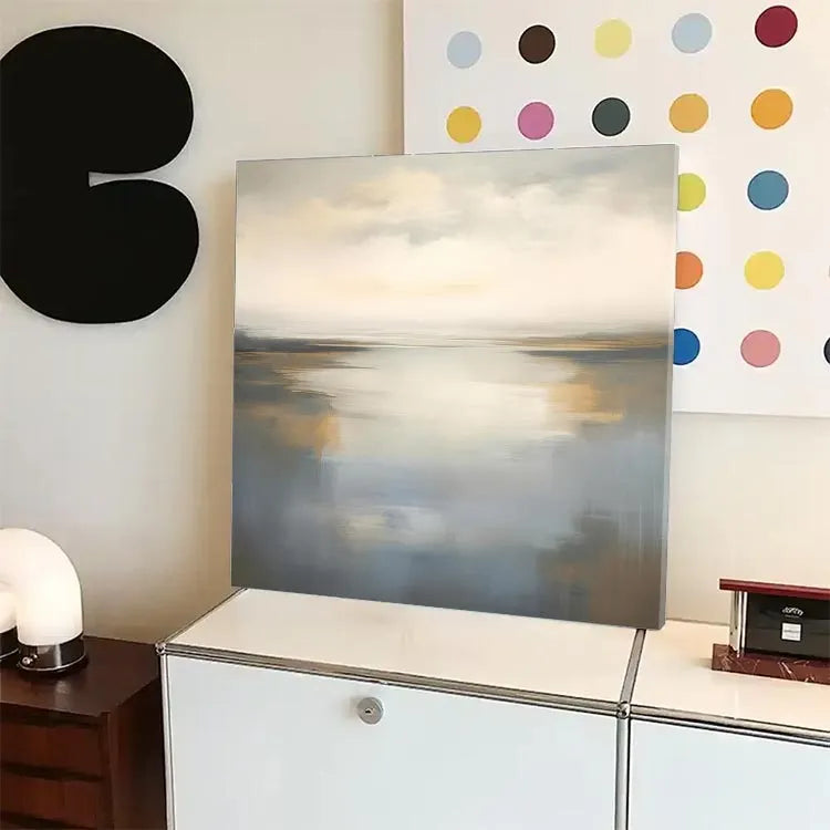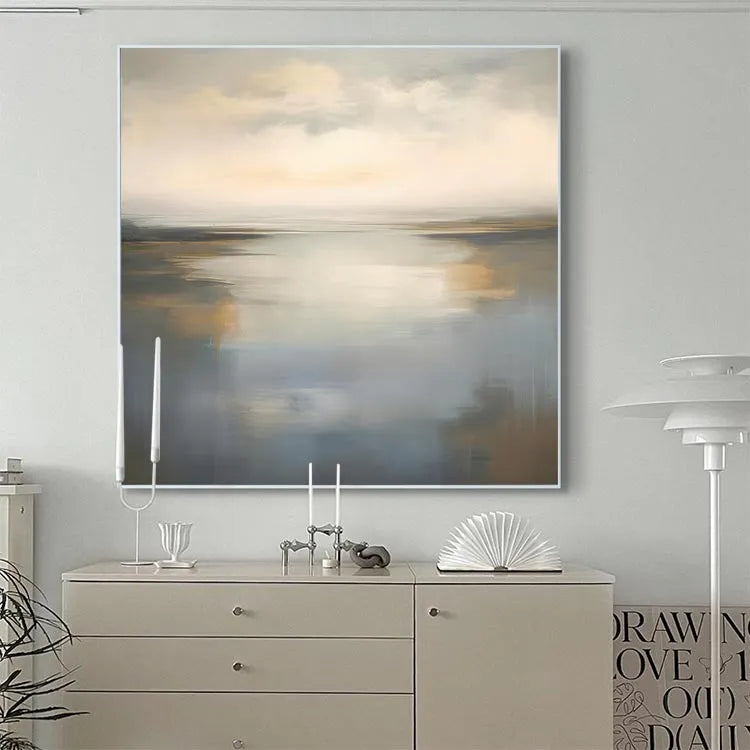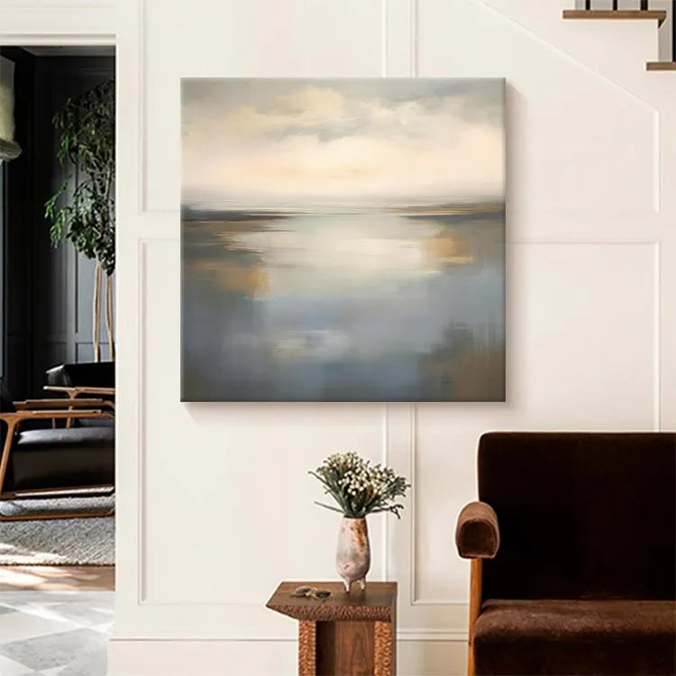 This oil painting exemplifies a serene, almost ethereal landscape, characterized by its smooth, blended textures and subtle color palette. The composition is balanced, with a calm, reflective body of water occupying the central portion, extending to a hazy horizon. The use of soft, diffused light creates a tranquil, almost dreamlike atmosphere. The color transitions from cool blues and grays in the water to warm, golden hues in the sky, suggesting a dawn or dusk setting. The brushstrokes are delicate and fluid, contributing to the painting's overall sense of calm and introspection. This work aligns with the principles of the Luminism movement, focusing on light and its effects on natural scenes. The subtle gradations of color and light evoke a sense of peacefulness and introspection.