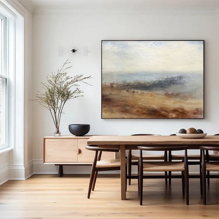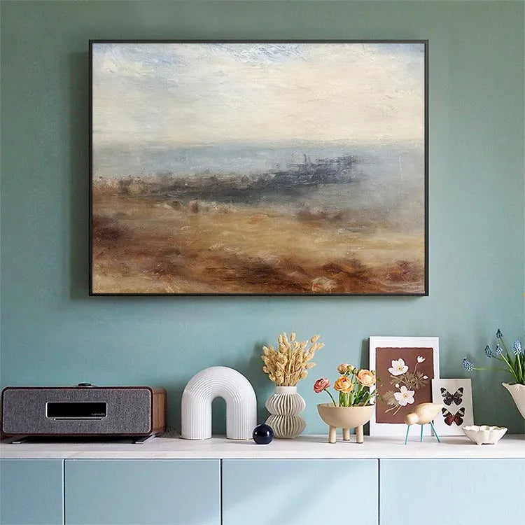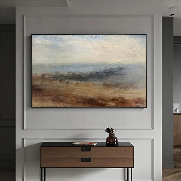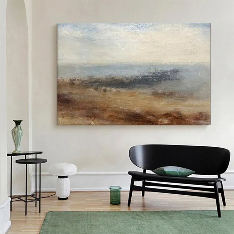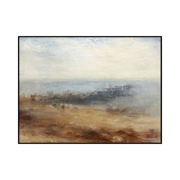 This oil painting employs a loose, impressionistic style, characterized by its diffuse, almost ethereal application of color and light. The artist uses a restrained palette of earthy browns, muted blues, and soft grays, creating a sense of calm and introspection. The texture of the brushstrokes is visible, with visible, yet gentle, application of paint that adds a sense of depth and movement. The composition is balanced, with the indistinct, darkened forms in the mid-ground suggesting a distant industrial structure, while the foreground remains a wash of lighter, more abstracted colors. The painting's use of light and shadow subtly guides the viewer's eye, adding a layer of depth and mystery. This work aligns with the Impressionist movement, focusing on capturing the essence of a moment rather than precise detail.