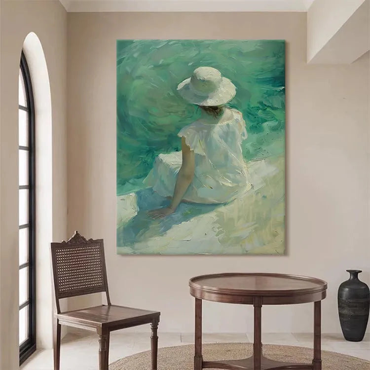 This painting, likely belonging to the Impressionist movement, employs a soft, ethereal style with loose, visible brushstrokes. The composition features a woman seated by a pool, her back to the viewer, creating a sense of introspection and tranquility. The use of color is particularly striking, with a dominant greenish-blue water background that contrasts with the pale, almost translucent white of the woman's dress and hat. Light is diffused, creating gentle shadows and a dreamlike atmosphere. The texture of the brushstrokes is smooth yet slightly rough, adding a tactile quality to the visual experience. Symbolically, the painting suggests a moment of peaceful reflection, with the woman's solitary presence and the calming water enhancing the overall sense of serene isolation.