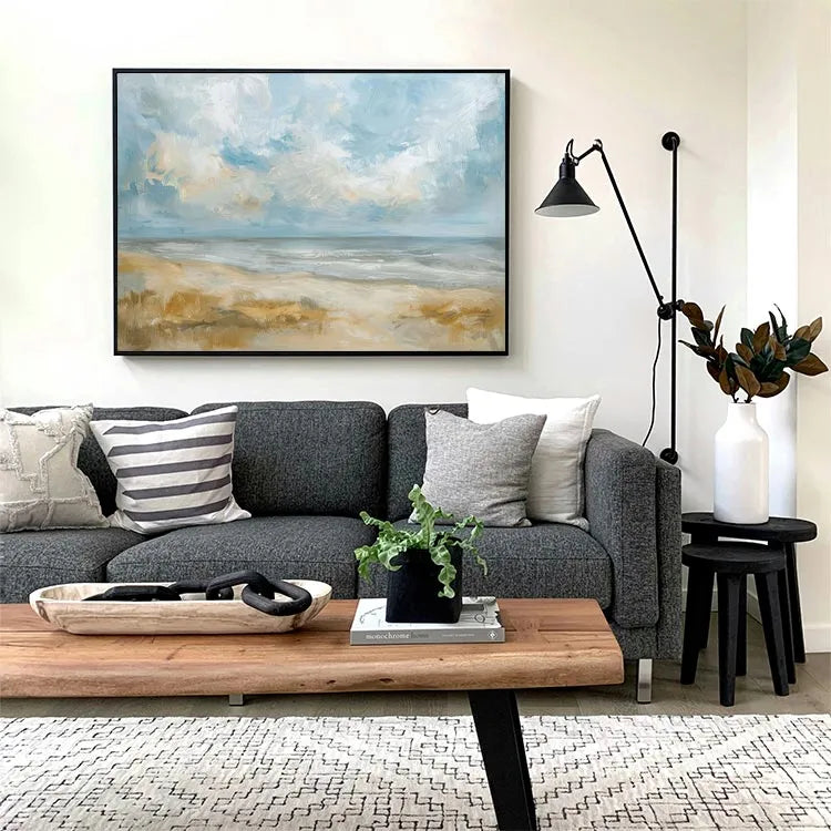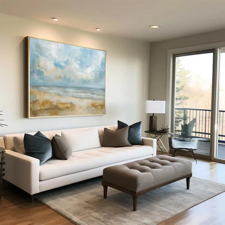 This oil painting,employs a loose, impressionistic style with broad, expressive brushstrokes that create a sense of movement and depth. The color palette is predominantly composed of soft blues, whites, and warm golden tones, which evoke a tranquil, yet dynamic seascape. The sky is rendered with thick, swirling brushstrokes that suggest clouds, while the beach below is depicted with more subdued, yet visible, textures. The use of color and light suggests a gentle, overcast day. The texture of the brushstrokes adds a tactile quality, enhancing the oil painting's emotional resonance. This piece may belong to the Impressionist movement, focusing on capturing the fleeting effects of light and atmosphere.