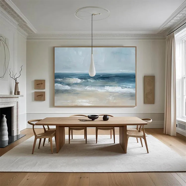 This oil painting exemplifies a minimalist approach, characterized by its restrained palette and abstract representation. The composition features a serene, expansive seascape, with the horizon line subtly blending into the sky. The artist employs broad, textured brushstrokes that convey the movement of waves and the gentle wash of the tide. The color palette is subdued, with cool blues and whites dominating the upper half, juxtaposed against the soft, sandy beige of the lower section. The use of light is subtle, with a diffuse, almost ethereal quality that suggests a calm, overcast day. The texture of the brushstrokes adds a tactile dimension, enhancing the sense of depth and realism. This work aligns with the principles of modern abstraction, focusing on the essence of the subject rather than detailed representation.