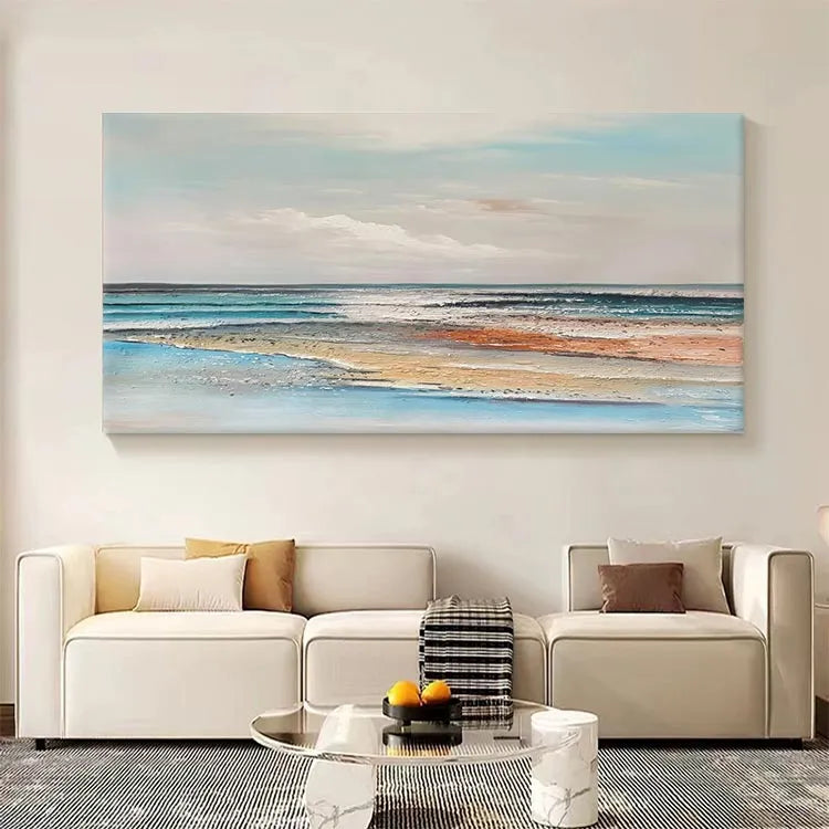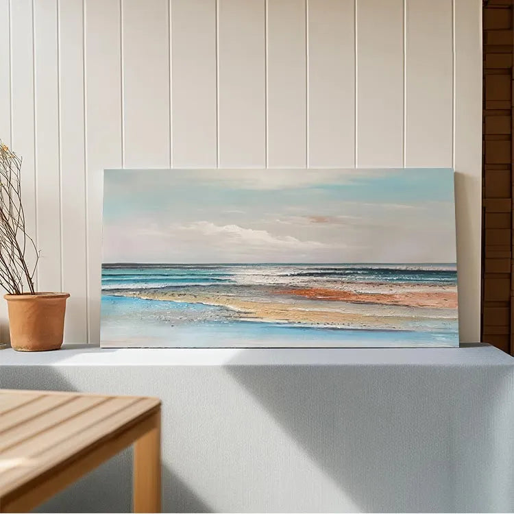 This oil painting captures a serene coastal landscape, characterized by its delicate use of color and light. The artist employs a subtle, almost ethereal palette, with gentle blues, sandy browns, and soft whites, evoking a tranquil, almost dreamlike atmosphere. The composition is balanced, with the horizon line subtly dividing the sky and sea. Textural brushstrokes are visible, particularly in the sand and water, adding a sense of movement and realism. The light is diffused, suggesting either dawn or dusk, and the clouds are softly rendered, contributing to the overall calm mood. The painting's style suggests influences of the Impressionist movement, focusing on light and atmosphere over detailed realism. The use of color and texture effectively conveys the delicate beauty of the coastal scene.