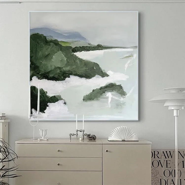 This oil painting employs a minimalist approach, focusing on the interplay between land and sea. The composition uses a gentle diagonal line, guiding the viewer's eye from the dark, textured cliffs on the left to the misty, expansive sea on the right. The color palette is restrained, with varying shades of green and white, creating a serene, almost ethereal atmosphere. The use of thick, textured brushstrokes in the cliffs contrasts with the smoother, more delicate strokes in the water, adding depth and movement. The subtle gradation of colors and light suggests a soft, overcast sky, typical of the Impressionist movement. The painting's simplicity and emphasis on natural beauty evoke a tranquil, contemplative mood.