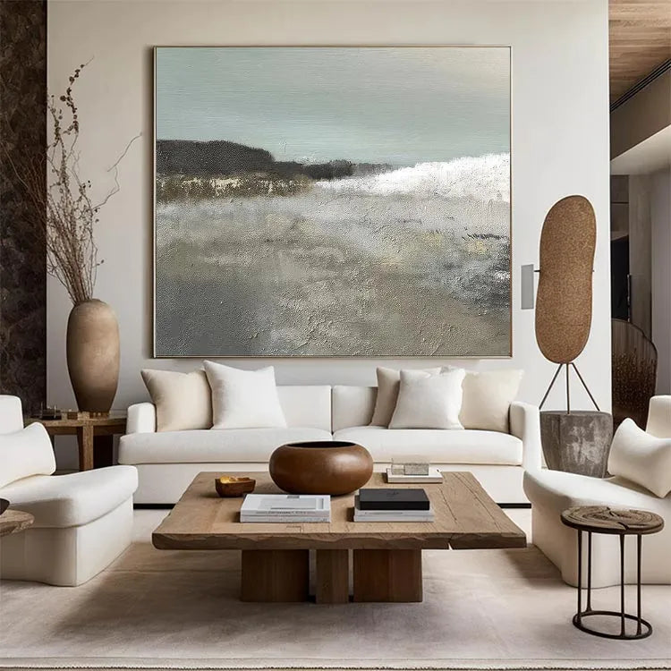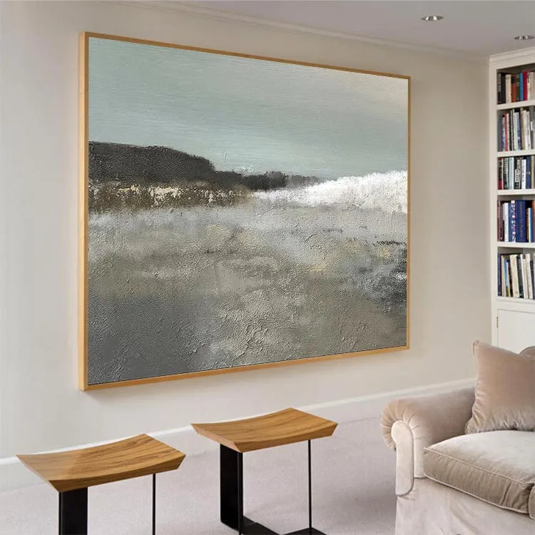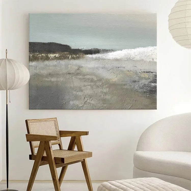 This oil painting presents a serene coastal landscape with a subtle, textured approach. The composition balances the gentle, rolling waves in the foreground with a distant, misty shoreline. The use of color is restrained, with muted greens and grays dominating the palette, evoking a calm, overcast day. The textured brushwork in the foreground suggests a sandy beach, while the softer, more delicate strokes in the background hint at the ocean's movement. The light is diffuse, contributing to the overall tranquility. The painting's style leans towards modern realism with a touch of impressionism, focusing on texture and mood over detailed representation. The subtle interplay of light and texture creates a peaceful, contemplative atmosphere.