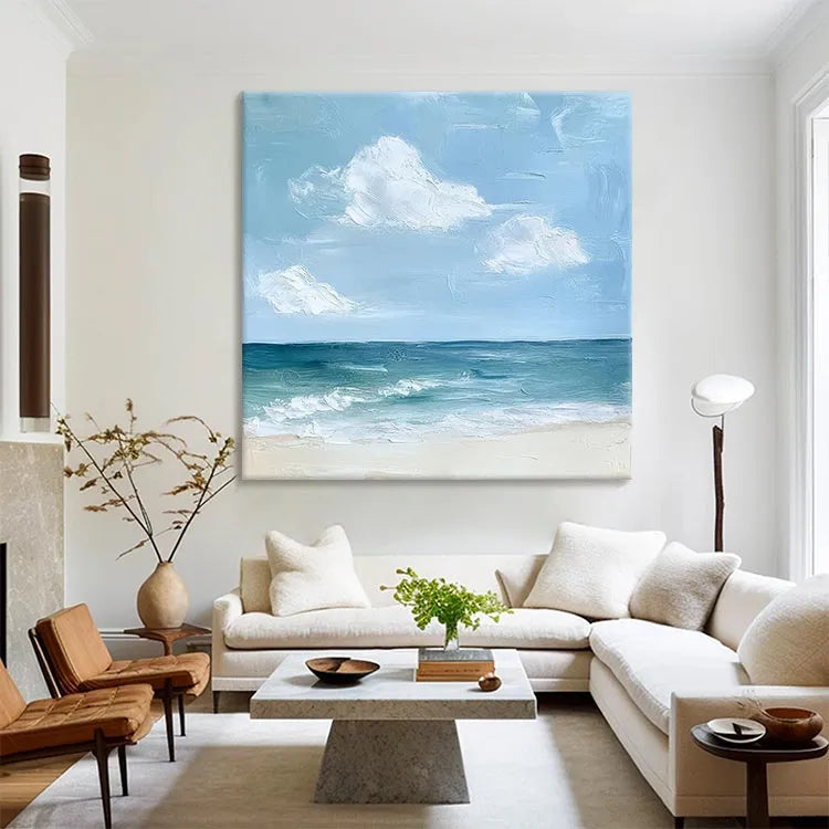 This oil painting captures a serene beach scene, characterized by its impressionistic style. The artist employs thick, expressive brushstrokes that create a textured effect, particularly in the depiction of the clouds and waves. The color palette is subdued, with soft blues and greens in the sky and sea, contrasted by the pale, almost white sand. The light is diffused, suggesting a calm, overcast day. The composition balances the horizon line, dividing the sky from the ocean, and the use of color evokes a tranquil, contemplative mood. The painting's loose, spontaneous technique and emphasis on texture align it with the Impressionist movement, echoing the works of artists like Claude Monet.