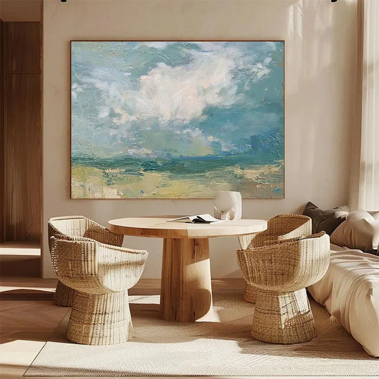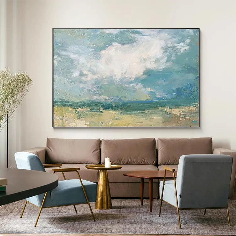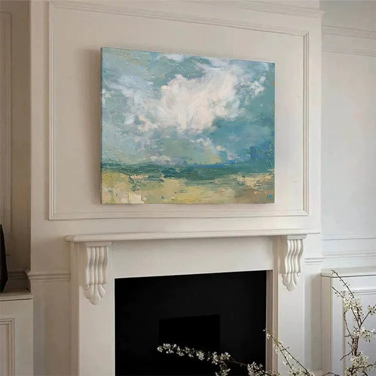 This oil painting exemplifies the Impressionist style, characterized by its loose, spontaneous brushwork and emphasis on light and color over detailed realism. The sky, painted with thick, swirling white and blue strokes, dominates the upper half of the canvas, suggesting a dynamic, cloud-filled atmosphere. The lower portion features a textured landscape with green and yellow hues, blending into each other with visible, expressive brushstrokes. The use of color is subtle yet effective, creating a sense of depth and movement. The texture of the paint, with its visible, almost tactile application, adds a layer of physicality to the composition. The painting's overall effect is one of serene, natural beauty, capturing a fleeting moment in time.