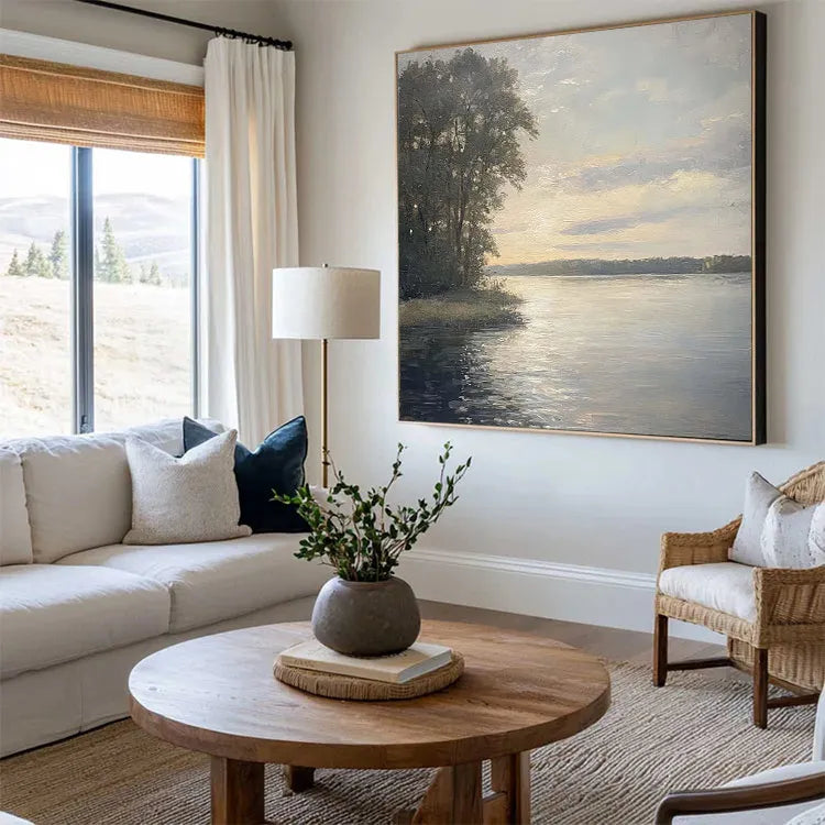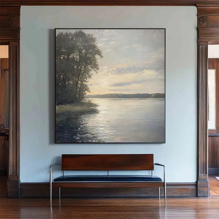 This oil painting exemplifies the qualities of the Hudson River School, characterized by its tranquil, romantic depiction of nature. The composition employs a balanced, horizontal structure, with the calm lake occupying the lower half and the softly lit sky the upper half. The use of color is subtle, with gentle gradients of blue, green, and gold creating a serene atmosphere. The artist employs delicate, visible brushstrokes that add texture to the foliage and water, enhancing the realism. Light is skillfully manipulated to suggest dawn or dusk, with the sun's glow reflecting off the water's surface. The tree line on the left provides a natural frame, guiding the viewer's eye across the peaceful landscape. The overall effect is one of tranquility and contemplation, evoking the sublime beauty of nature.