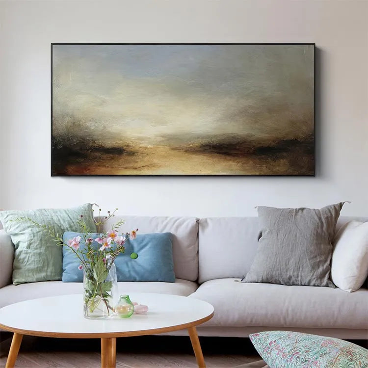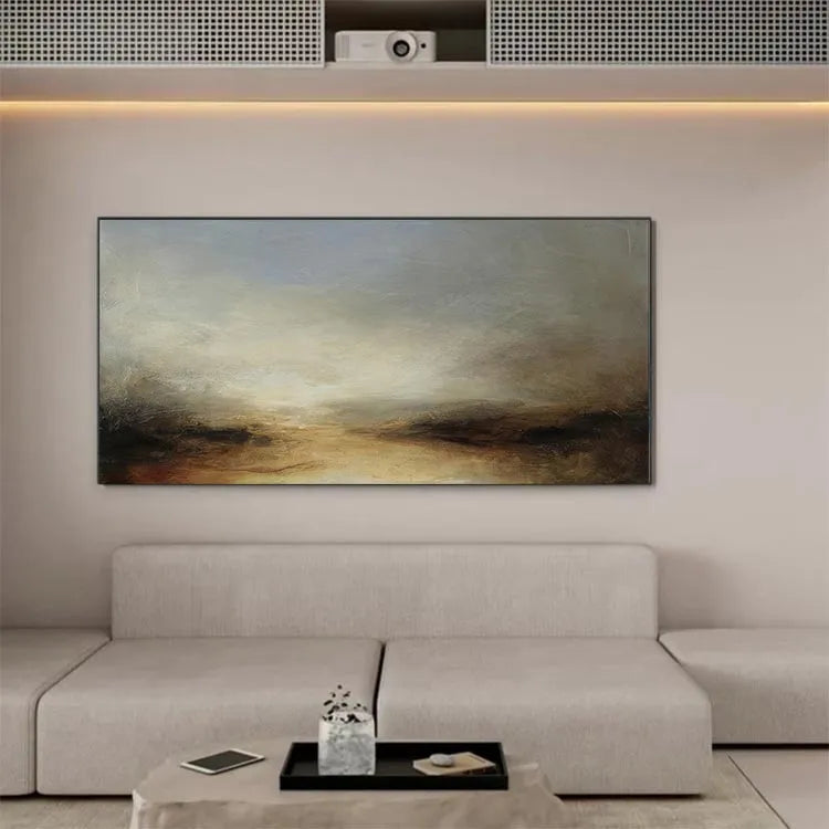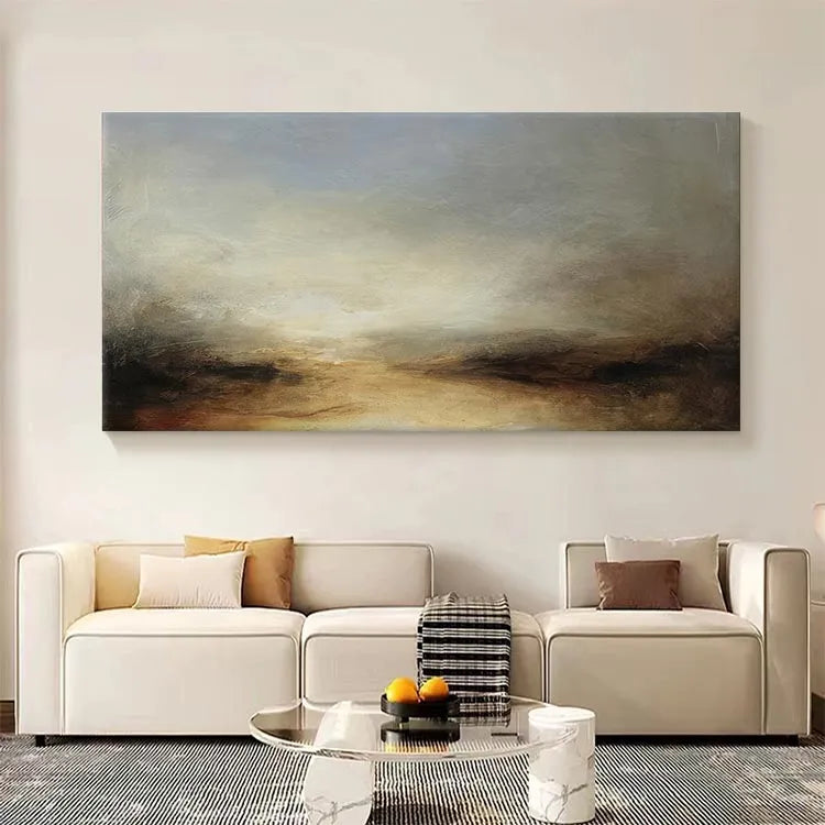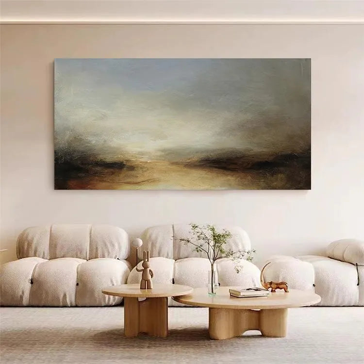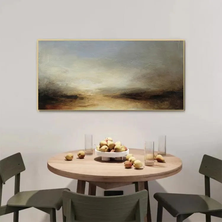 This oil painting employs a romantic, atmospheric style, reminiscent of the 19th-century landscape tradition. The composition is dominated by a subtle, almost ethereal pathway that leads the viewer's eye towards a luminous, misty horizon. The use of color is restrained, with a muted palette of browns, grays, and soft blues, creating a sense of depth and mystery. The artist employs delicate, almost impressionistic brushstrokes, which blend and merge to form a textured, misty effect. Light is subtly diffused, suggesting an overcast or dawn setting, and the interplay of light and shadow adds a sense of depth and realism. The overall effect is tranquil and introspective, evoking a sense of journey or transition. The painting's style suggests influences from the Romantic movement, focusing on the sublime and the emotional impact of nature.