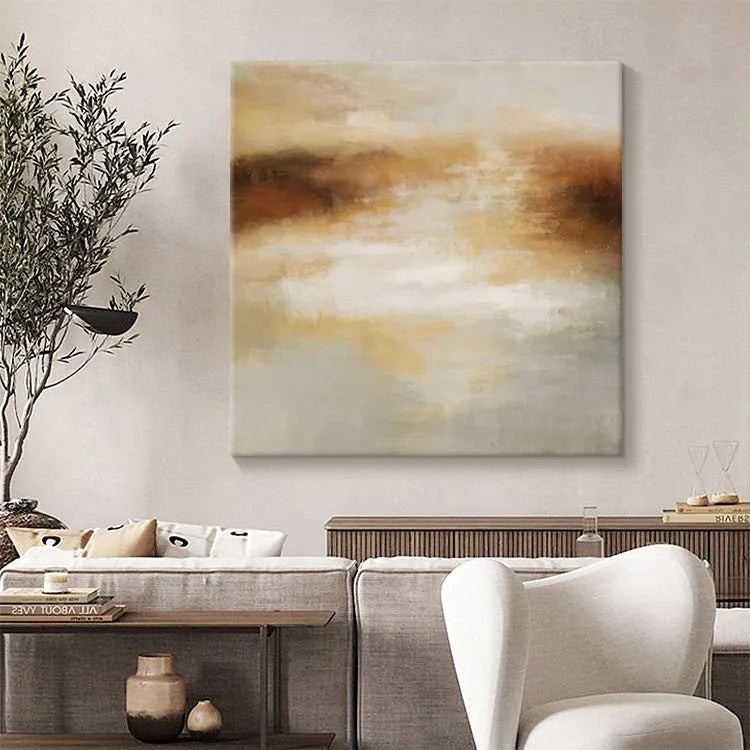 This oil painting exemplifies the Abstract Expressionism movement, characterized by its spontaneous and gestural brushwork. The composition features a horizontal band of warm, earthy browns and oranges, juxtaposed against a softer, lighter palette of whites, creams, and subtle grays. The brushstrokes are loose and fluid, creating a sense of movement and depth. The use of color suggests a contrast between the solidity of the earthy tones and the ethereal, almost mist-like quality of the lighter areas. The texture is visibly rough, with visible brushstrokes adding a tactile quality to the piece. The overall effect is one of dynamic balance, evoking a sense of natural landscape or atmospheric phenomenon.