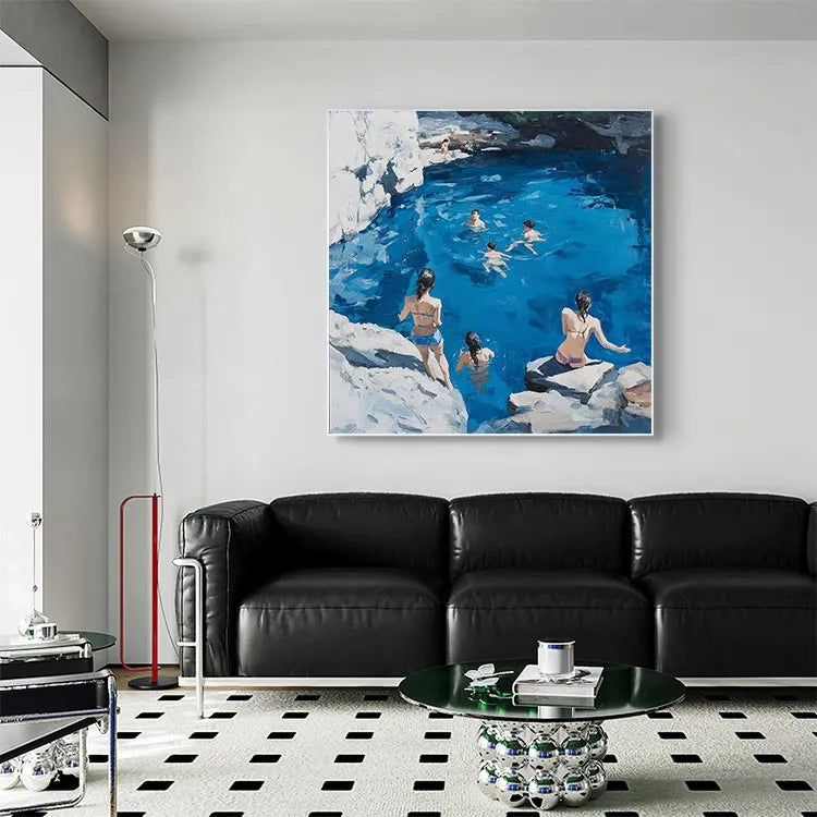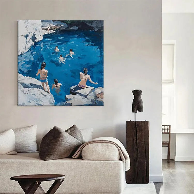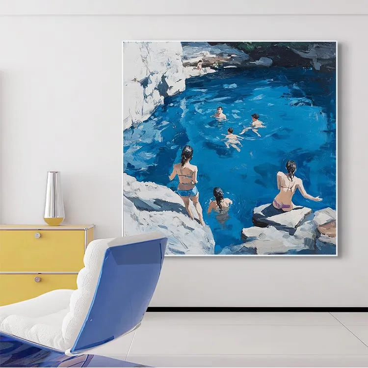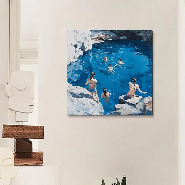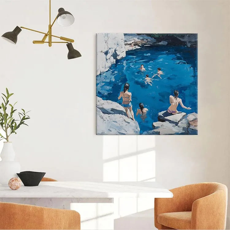 This oil painting captures a serene, natural scene of children swimming in a rocky, blue-tinged pool. The composition uses a balanced, triangular arrangement, with the central focus on the children in the water. The artist employs a realistic style, characterized by visible brushstrokes that add texture to the rocky surfaces and the water's surface. The vivid blue of the water contrasts with the muted whites and grays of the rocks, creating a sense of depth and tranquility. The use of light is subtle yet effective, highlighting the children's forms and the water's reflections. The painting's style suggests influences of Impressionism, focusing on light and natural beauty, while the detailed brushwork hints at a modern, realistic approach. The overall effect is peaceful and inviting, evoking a sense of childhood innocence and natural joy.