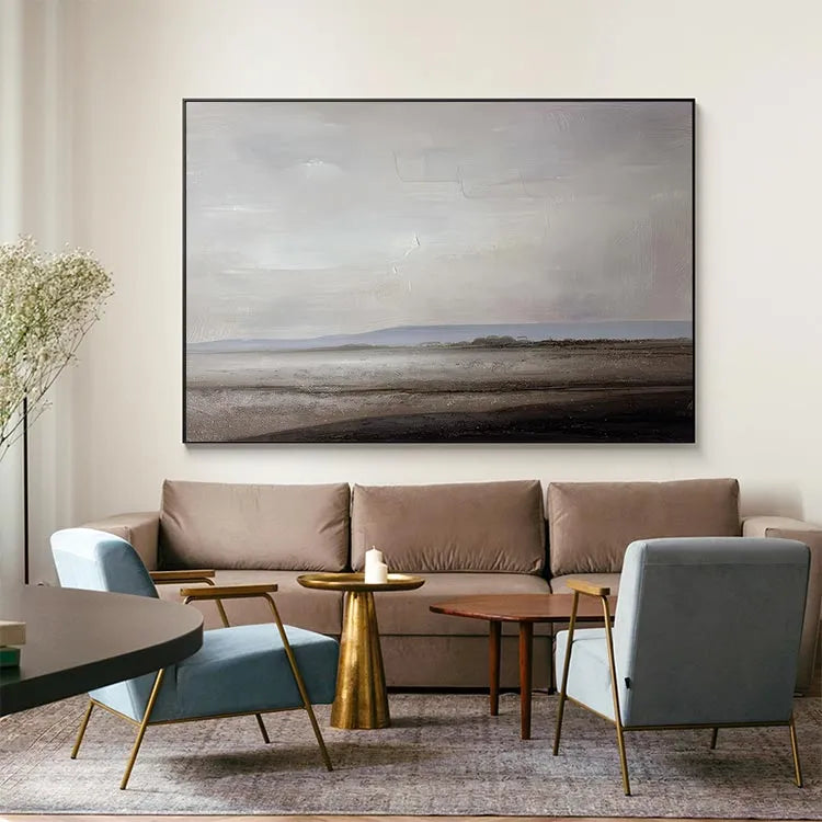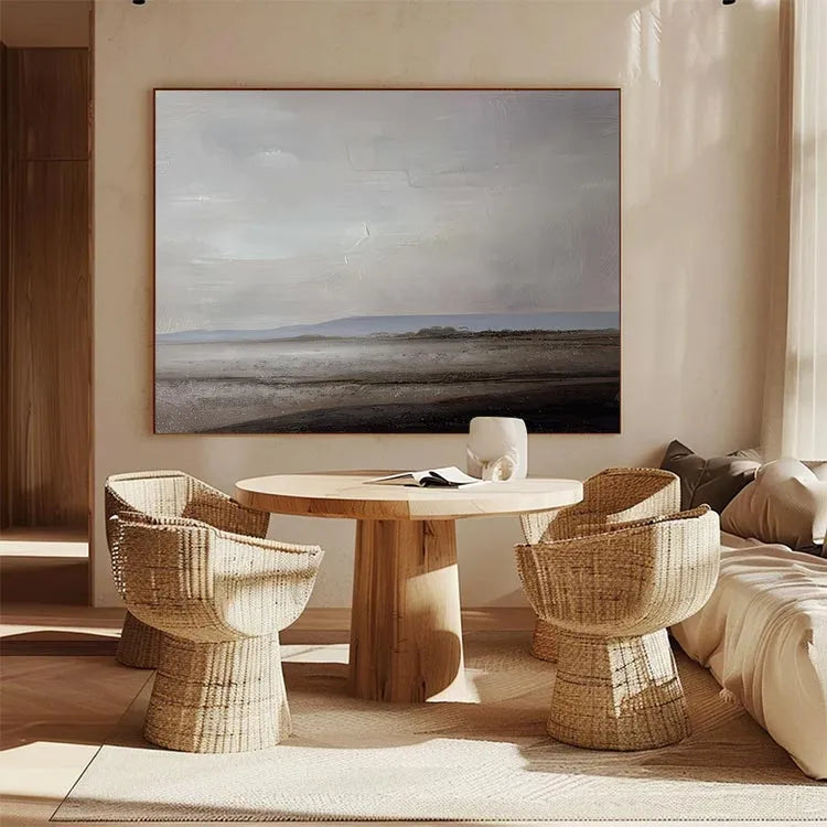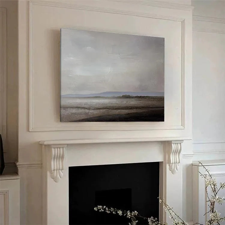 This oil painting exemplifies a minimalist and realistic style, evoking a serene, almost desolate landscape. The composition is balanced, with the horizon line subtly dividing the sky from the earth, creating a sense of vastness and openness. The color palette is muted, dominated by soft grays, blues, and browns, which contribute to the painting's tranquil and contemplative mood. The artist's use of light is subtle, with a gentle gradient in the sky suggesting an overcast or dawn setting. Textural brushstrokes are visible, adding depth and a tactile quality to the wet, reflective surface of the water in the foreground. The painting's simplicity and restrained color choices align it with the principles of the modernist movement, emphasizing the beauty of the unembellished landscape.