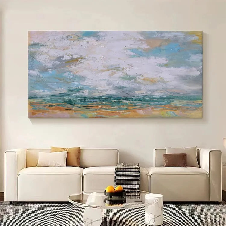 This oil painting showcases a dynamic seascape, characterized by an impressionistic style. The artist employs thick, textured brushstrokes that blend and merge colors, creating a sense of movement in both the sky and water. The composition is vertically oriented, with the sky dominating the upper two-thirds and the sea occupying the lower third. The use of color is subtle yet effective, with pale blues, whites, and greens in the sky, and warmer oranges and greens in the water, suggesting a serene yet lively atmosphere. The light is diffused, with soft, almost ethereal transitions between colors, evoking a tranquil, almost dreamlike quality. The textured brushstrokes add a tactile dimension, enhancing the painting's sense of depth and realism. This work may belong to the Impressionist movement, emphasizing light and color over detailed representation.