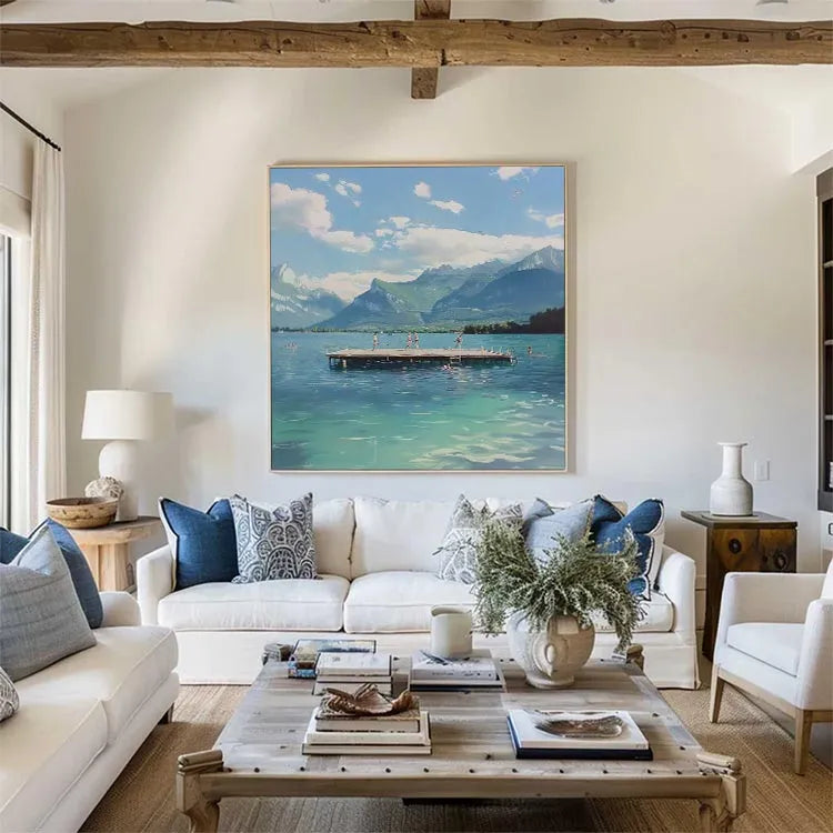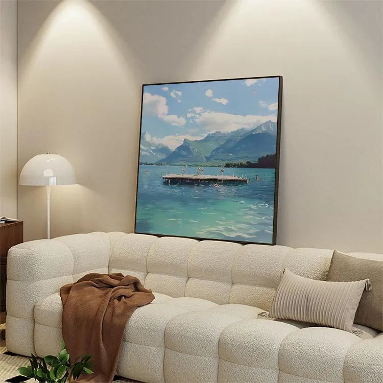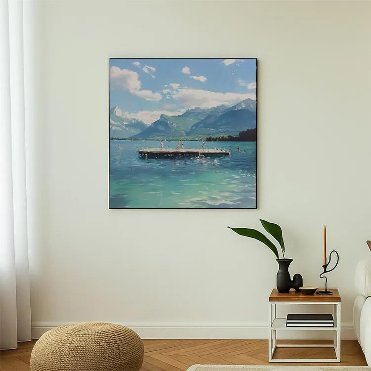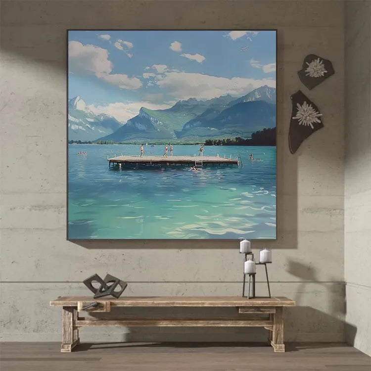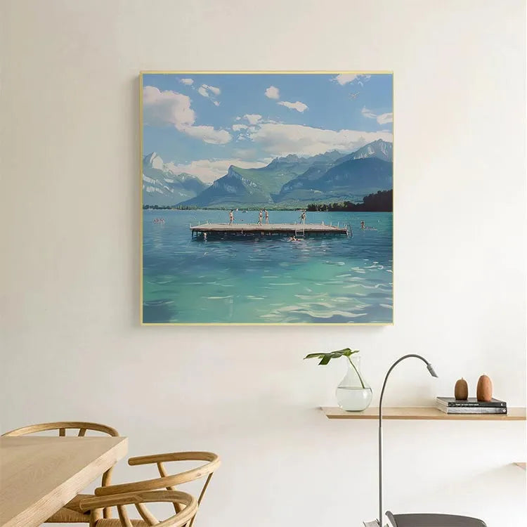 This painting, likely influenced by Romanticism, showcases a serene lakeside scene with a wooden dock and people enjoying the water. The composition balances the dock in the foreground with the expansive, mountainous landscape in the background. The use of color is striking, with the turquoise lake contrasting against the green and blue mountains, and the sky filled with soft, white clouds. Light plays a crucial role, with sunlight reflecting off the water, creating a tranquil, almost magical atmosphere. The smooth, detailed brushstrokes and the subtle blending of colors suggest a digital medium, reminiscent of 19th-century landscape paintings. The overall effect is peaceful, inviting viewers to appreciate the beauty of nature.