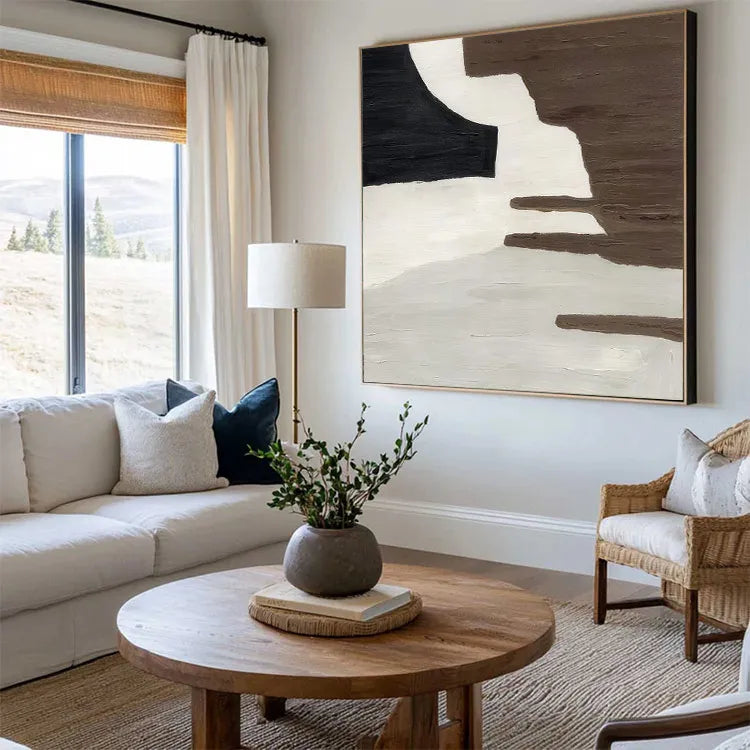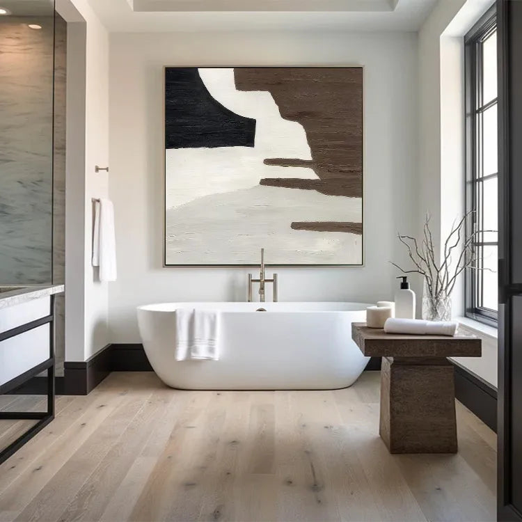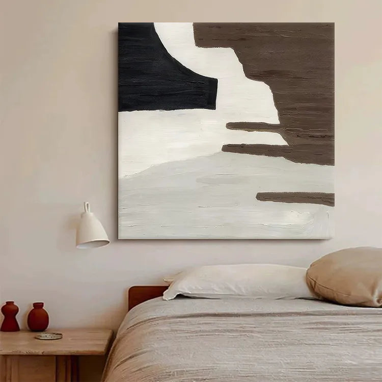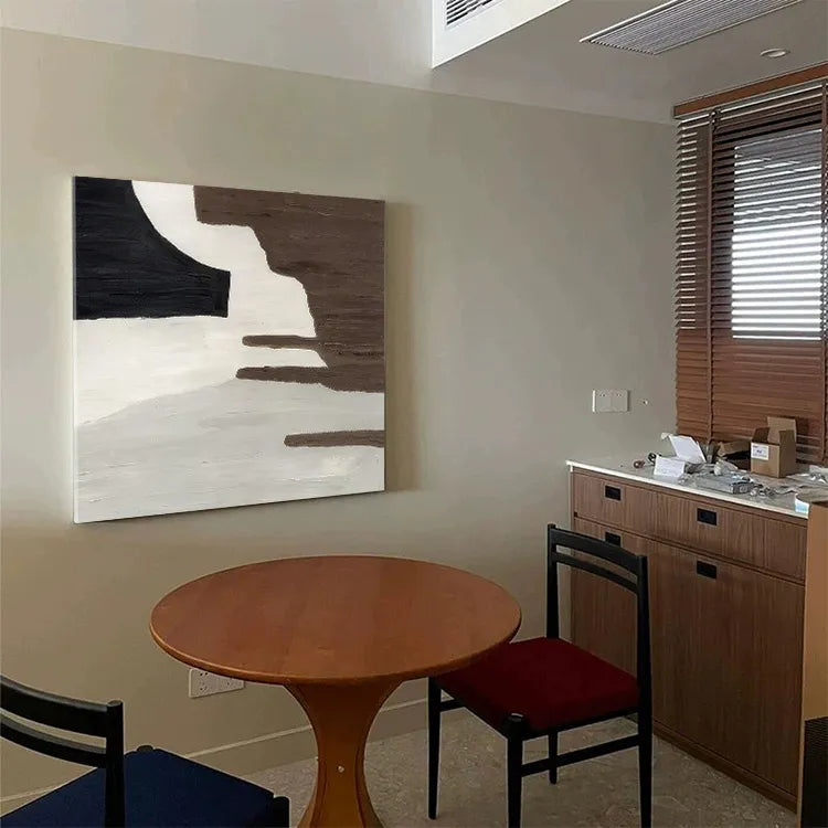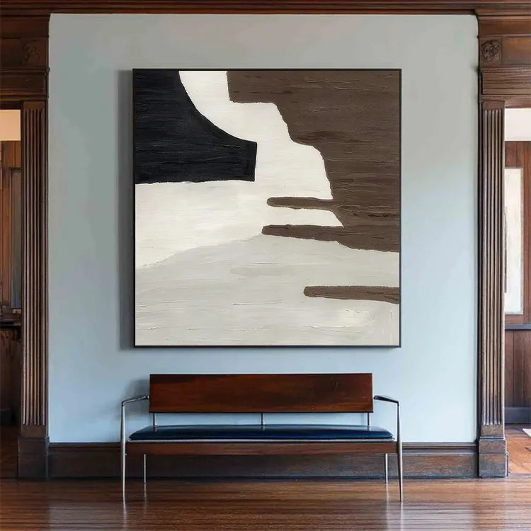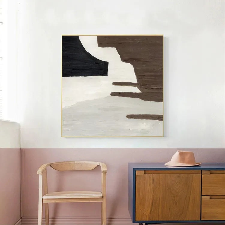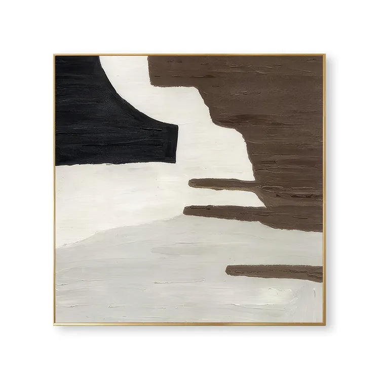This oil painting employs a minimalist, abstract style, characterized by its restrained color palette and geometric forms. The composition features a juxtaposition of black, white, and brown areas, creating a stark contrast that draws the viewer's eye. The brushstrokes are visible and textured, adding a tactile quality to the surface. The black and white sections are smooth, while the brown areas have a rougher texture, suggesting a deliberate choice to highlight different planes and dimensions. The use of color is symbolic, possibly representing a duality or contrast within a singular entity. This work aligns with the principles of the Abstract Expressionist movement, focusing on the emotional and visual impact of color and form rather than realistic representation.