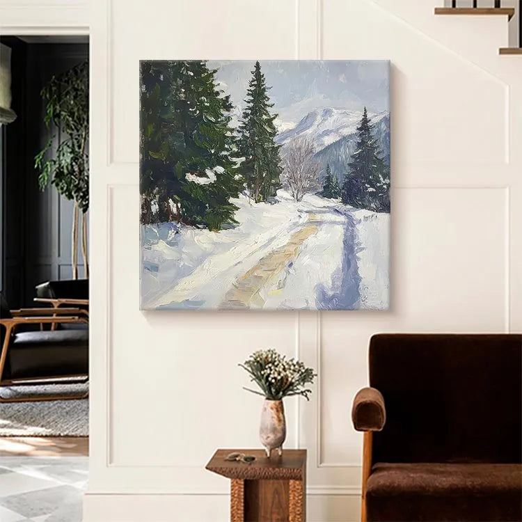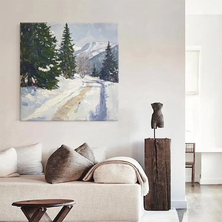 This oil painting captures a serene winter landscape with a focus on natural beauty and tranquility. The composition features a winding path through a snowy forest, with tall, dark green pine trees on the left and a solitary, leafless tree in the center. The use of color is subtle yet effective, with cool whites and blues dominating the scene, contrasted by the dark greens of the pines and the pale yellow of the path. The brushstrokes are loose and expressive, creating a textured, almost impressionistic effect. Light is softly diffused, suggesting a cloudy winter day. The style aligns with the Impressionist movement, emphasizing mood and light over detailed realism. The painting's symbolism may reflect the quiet beauty and resilience of nature during winter.