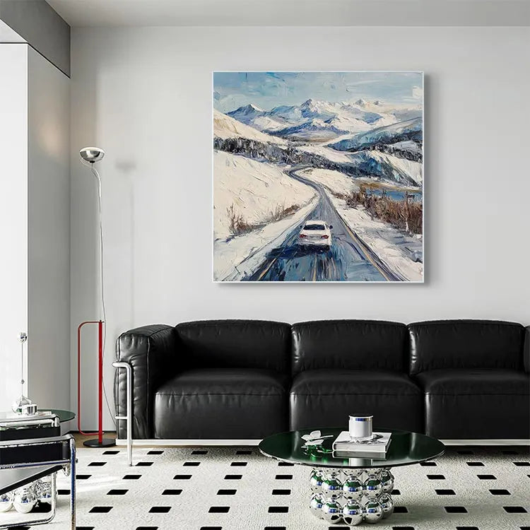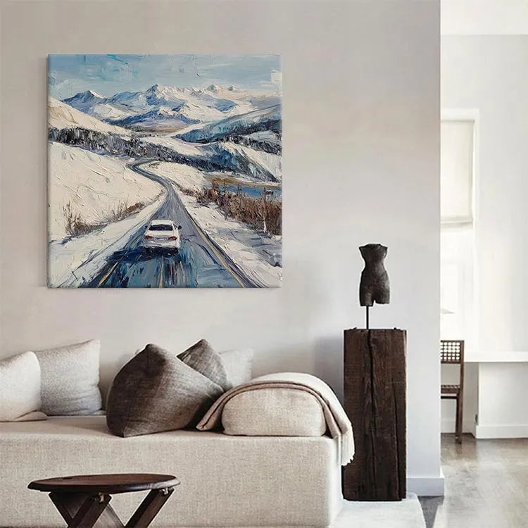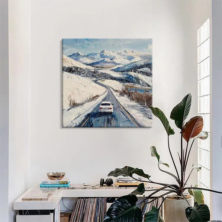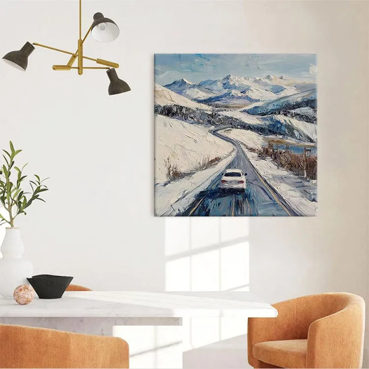 This oil painting depicts a snowy mountain landscape with a single white car driving on a winding road. The artist employs a realistic style, with visible, textured brushstrokes that convey the roughness of the snow and the road's surface. The use of color is restrained, with a palette dominated by whites, blues, and subtle browns, evoking a cold, wintery atmosphere. The light is diffused, suggesting an overcast sky, which enhances the sense of chill and isolation. The composition leads the viewer's eye along the road, emphasizing the journey and the vast, snowy expanse. The brushwork and texture suggest influences from the Impressionist movement, while the subject matter and realism lean towards contemporary landscape painting.