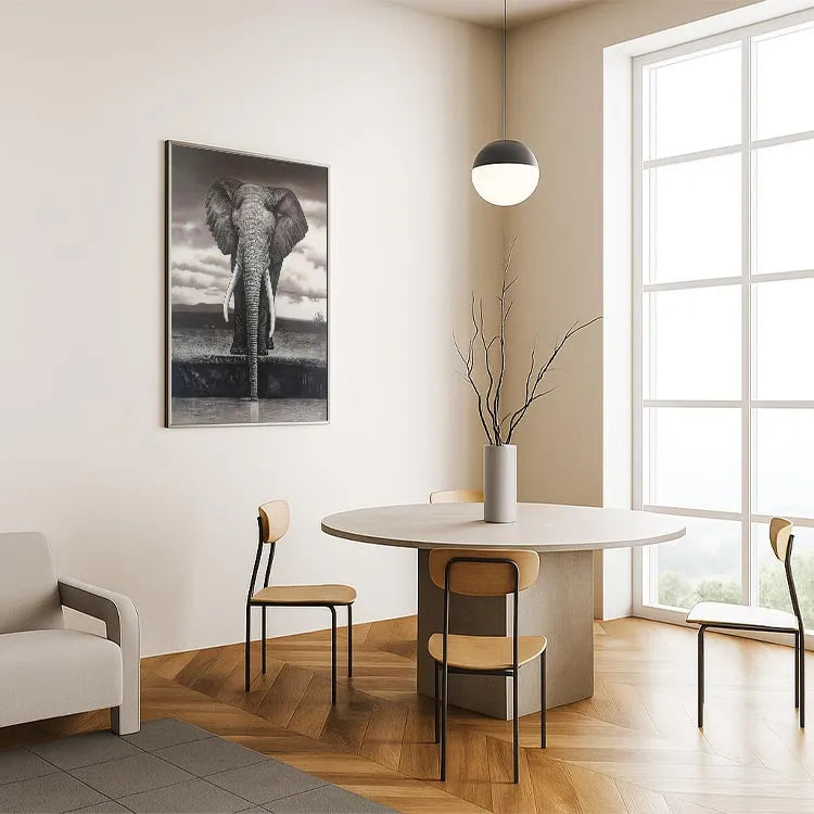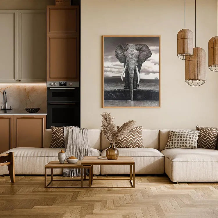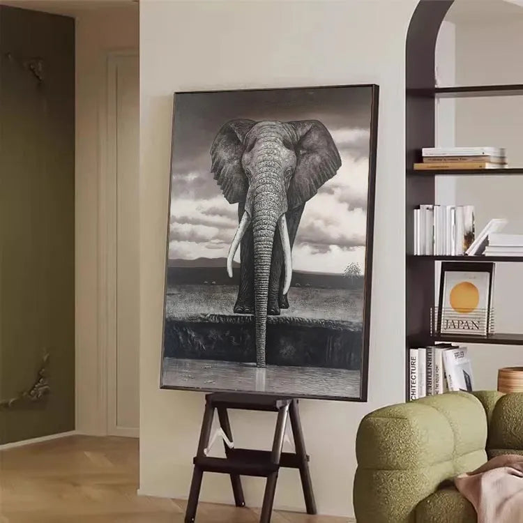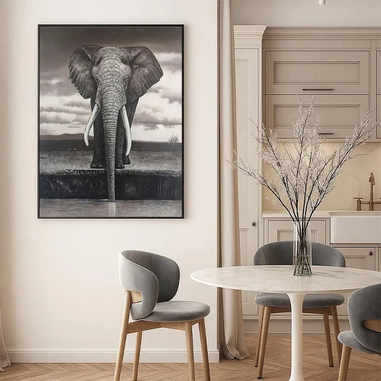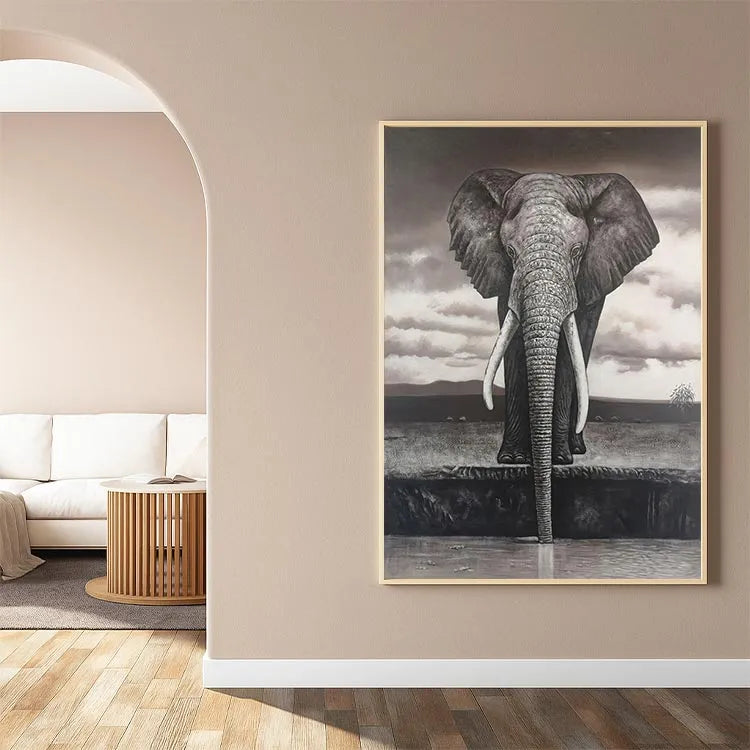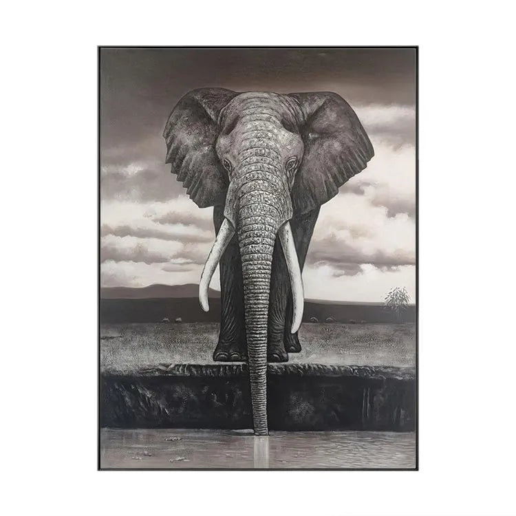 This oil painting depicts a majestic elephant standing at the edge of a water body, with its long trunk partially submerged. The monochromatic palette, dominated by shades of gray and brown, creates a somber, almost melancholic atmosphere. The artist employs a realistic style, with meticulous attention to the elephant's textured skin and detailed wrinkles. The use of light and shadow enhances the three-dimensional quality, particularly in the elephant's prominent tusks and ears. The sky's cloudy texture contrasts with the elephant's solidity, suggesting a connection between the natural world and the sublime. The composition's verticality, focusing on the elephant, draws the viewer's eye upward, emphasizing its grandeur. This work may be associated with the Realism movement, characterized by its detailed representation and emotional depth.
