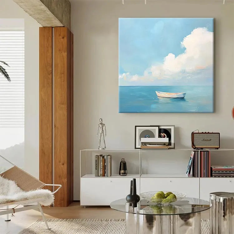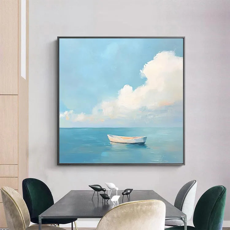 This oil painting depicts a serene, solitary boat floating on a calm, expansive sea, with a large, fluffy cloud in the sky. The composition employs a balanced, horizontal layout, emphasizing tranquility and isolation. The use of color is subtle, with soft blues and whites dominating the palette, creating a peaceful, almost ethereal atmosphere. The light is diffused, suggesting a gentle, overcast day. The brushstrokes are delicate and smooth, with visible texture in the cloud and water, adding a sense of depth and realism. The style is reminiscent of Impressionism, with its emphasis on light and color, and the simplicity of the scene evokes a sense of calm and introspection. The overall effect is soothing and contemplative.