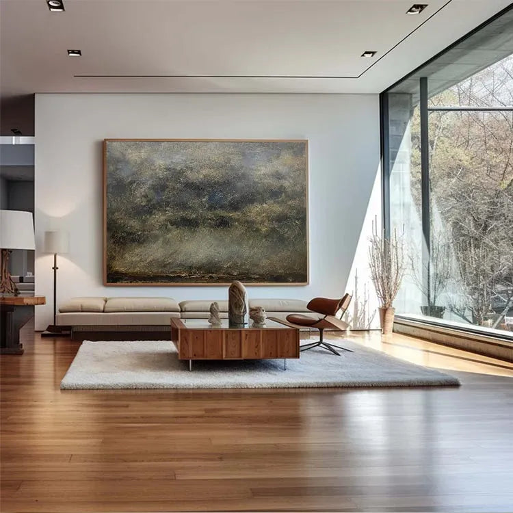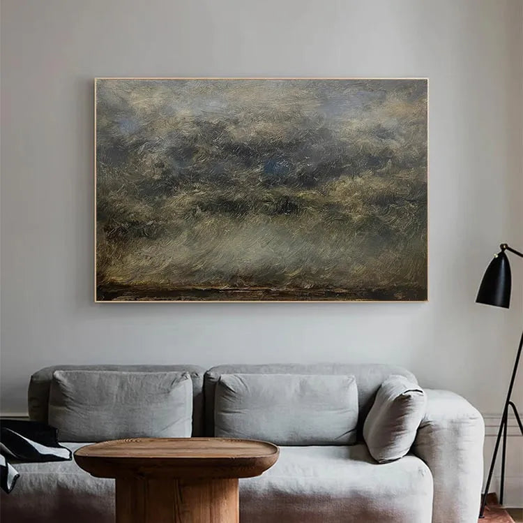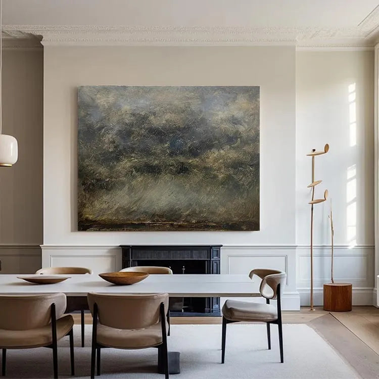 This oil painting employs a textured, impressionistic style, characterized by thick, expressive brushstrokes that create a sense of movement and depth. The composition is abstract, with a focus on the interplay of light and dark tones, suggesting a natural landscape or sky. The use of color is subtle, with muted greens, browns, and blues, evoking a serene, overcast atmosphere. The textured brushwork adds a tactile quality, enhancing the visual interest and dynamism of the piece. The painting's style is reminiscent of the Impressionist movement, particularly in its emphasis on light and natural forms. The overall effect is one of quiet, contemplative beauty.