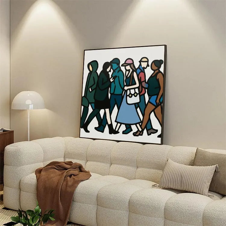 This artwork, likely a digital illustration, employs a minimalist, stylized approach with bold, black outlines and a limited color palette. The composition features a diverse group of pedestrians, with varying postures and attire, suggesting a bustling urban environment. The use of flat, solid colors—primarily blues, greens, and browns—creates a sense of unity and cohesion among the figures. The lack of detailed facial features emphasizes the collective over the individual, aligning with modernist tendencies. The simple, geometric shapes and the emphasis on movement and interaction reflect influences of the Cubist movement, with a contemporary twist. The texture is smooth, and the overall style is reminiscent of mid-20th-century abstraction.