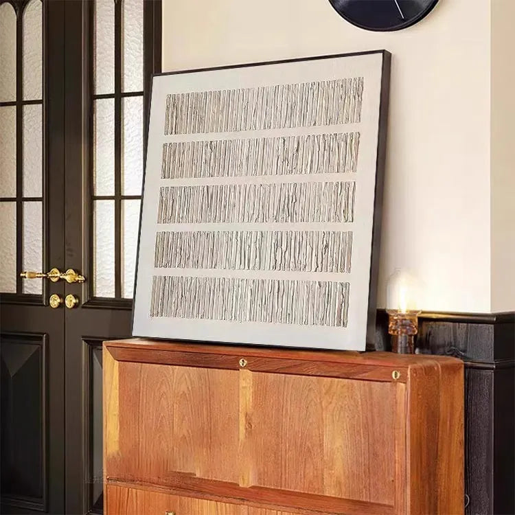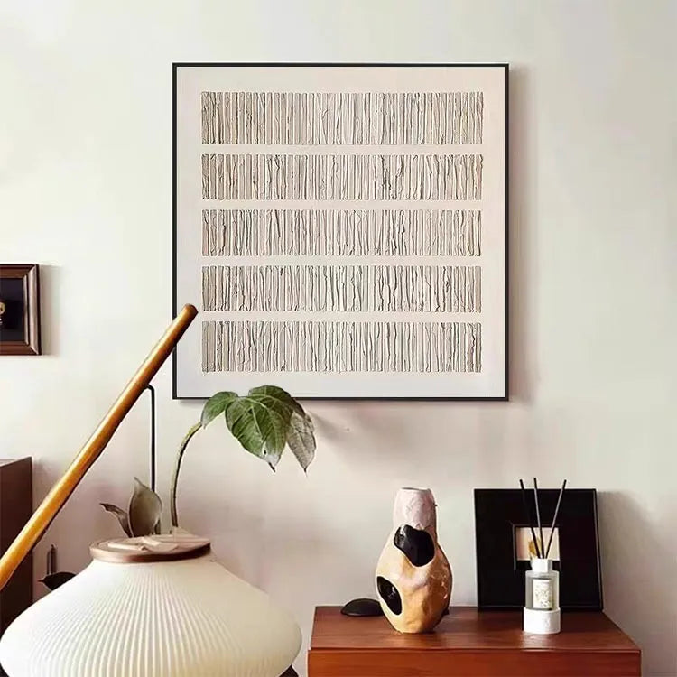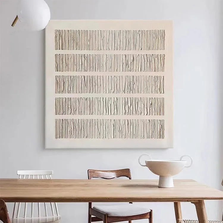 This artwork features a series of evenly spaced, vertically oriented rectangular columns, each composed of delicate, textured lines that resemble crinkled paper. The overall composition is symmetrical and orderly, with a minimalist approach that emphasizes repetition and texture. The color palette is subdued, dominated by beige and off-white tones, which creates a sense of calm and introspection. The light, subtle shadows add depth without overwhelming the simplicity of the design. The texture of the lines suggests a tactile quality, inviting the viewer to imagine the physicality of the crinkled paper. This piece aligns with the principles of Minimalism, focusing on form, texture, and the interplay between simplicity and subtle complexity. The artist's use of repetition and texture creates a meditative, almost abstract representation of structure and order.