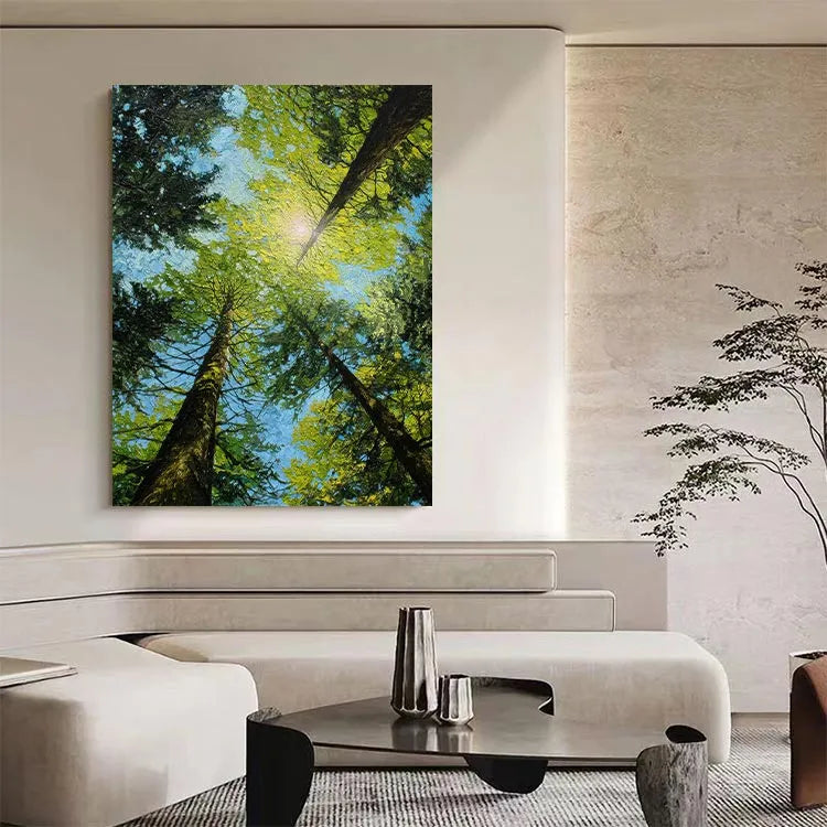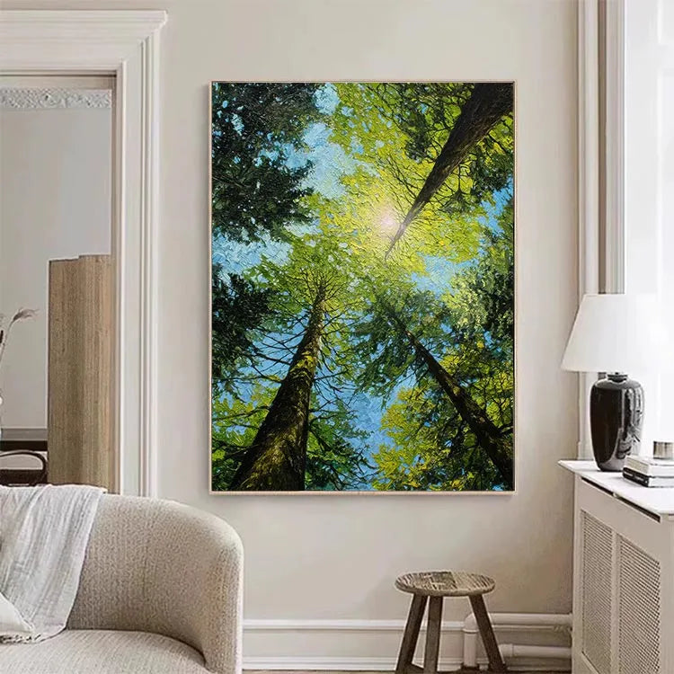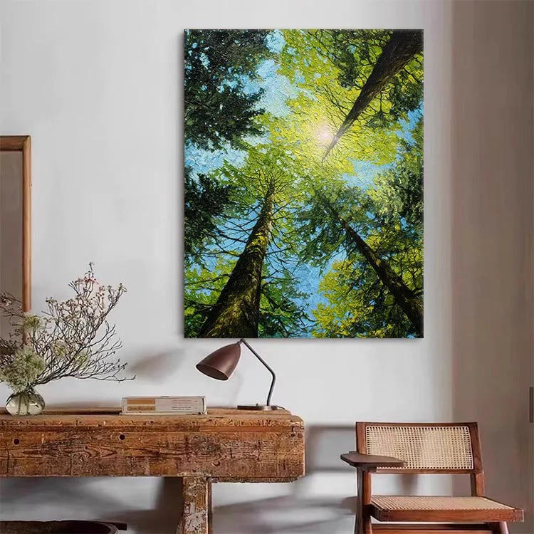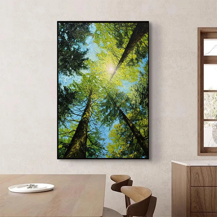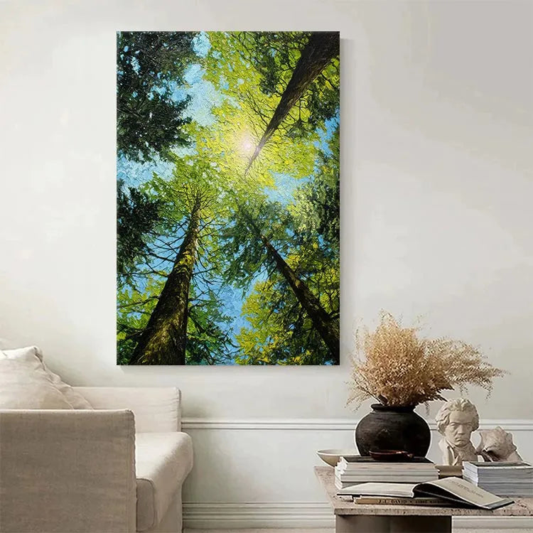This painting captures a breathtaking upward view of a forest canopy, emphasizing the towering trees and the interplay of light and shadow. The composition is dynamic, with tall, slender trees converging towards the sun, which is positioned centrally and creates a radiant, almost ethereal glow. The use of color is vibrant, with lush greens and bright yellows of the leaves contrasting against the clear blue sky. The texture of the tree bark is detailed, suggesting a realistic style, yet the overall effect is slightly abstract due to the overlapping, impressionistic brushstrokes. The light, diffused through the leaves, creates a sense of depth and serenity, reminiscent of the naturalism movement, with a nod to Impressionism's emphasis on light and color. The painting evokes a sense of wonder and tranquility, inviting viewers into the peacefulness of the forest.
