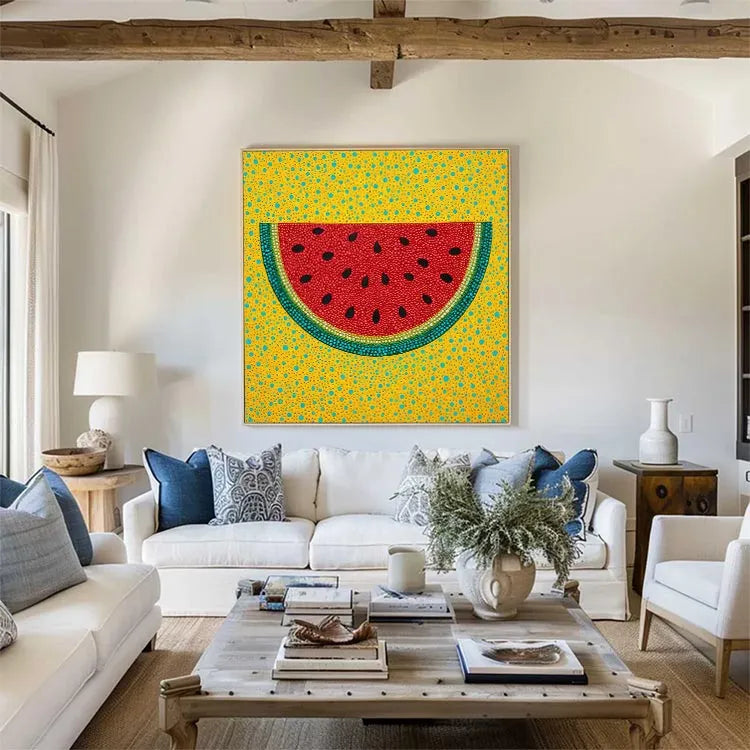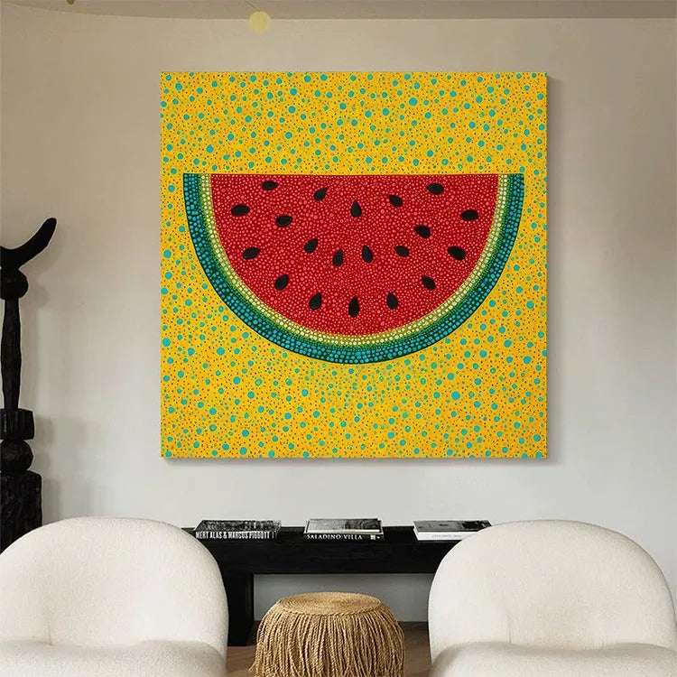 This vibrant digital artwork features a stylized slice of watermelon against a yellow background adorned with blue polka dots. The composition centers the watermelon slice, which is rendered with a textured, mosaic-like pattern in red, black, and green. The use of color is striking, with the vivid red of the watermelon contrasting sharply against the bright yellow and blue dots. The texture suggests a tactile, almost three-dimensional quality, while the polka dots add a playful, rhythmic element. This piece could be associated with the Pop Art movement, characterized by its bold use of color and playful, everyday subjects. The digital medium allows for precise, repetitive patterns, enhancing the visual impact and texture.