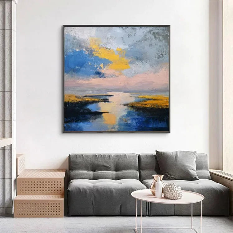 This painting exemplifies a modern abstract style, with a focus on emotional expression rather than realistic representation. The composition features a reflective waterway, bordered by golden-yellow and blue-green marshlands, leading the eye toward a soft, pink-tinged horizon. The use of color is bold and dynamic, with vibrant yellows and blues juxtaposed against the muted pinks and grays, creating a sense of contrast and movement. The texture is rich and tactile, with visible brushstrokes that add depth and layering to the sky and water. The light source, suggested by the yellow and pink hues, illuminates the scene from above, enhancing the reflective quality of the water. The painting's style and use of color evoke the Impressionist movement, while its abstract nature suggests influences from Modernism.
