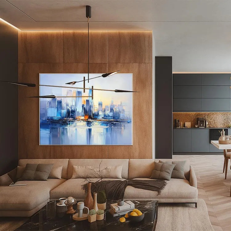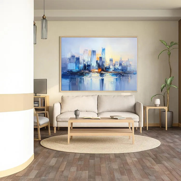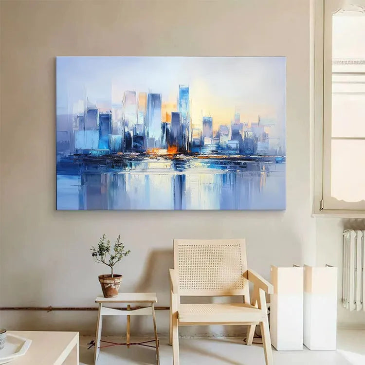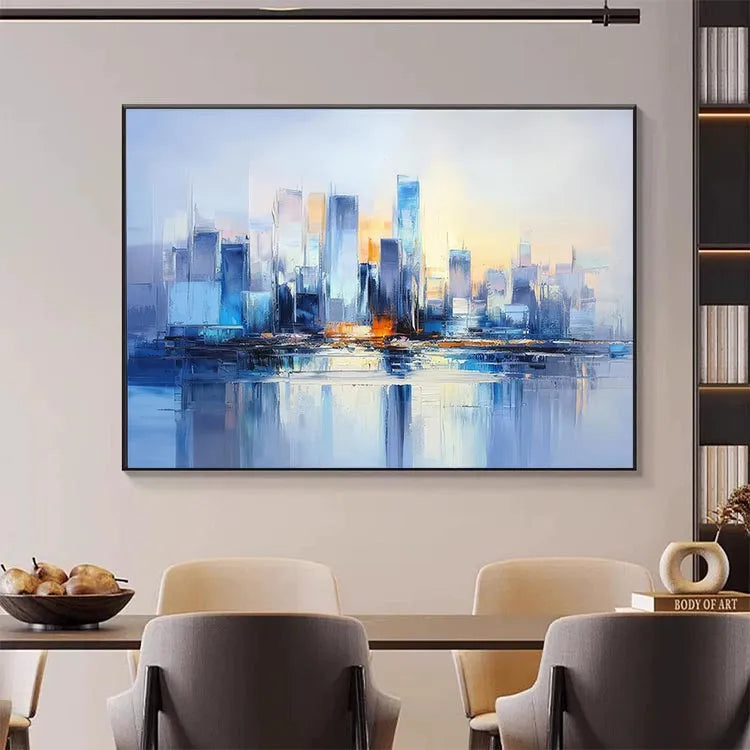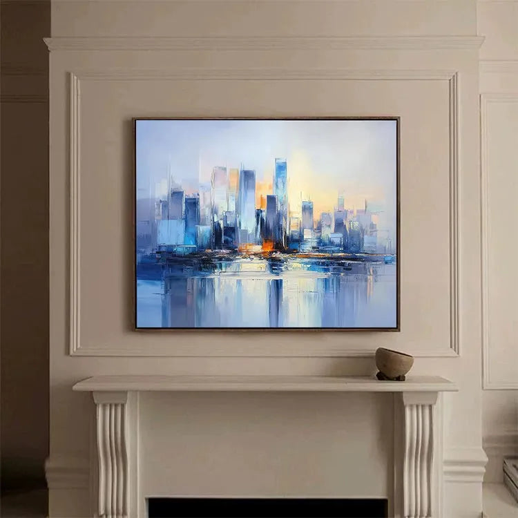 This abstract painting features a cityscape reflected in a water body, characterized by a blend of cool and warm colors. The use of blue, orange, and yellow hues creates a dynamic yet harmonious contrast, evoking a sense of dawn or dusk. The brushstrokes are loose and expressive, with visible texture adding depth and movement to the composition. The light source, likely from the sky, illuminates the skyscrapers, casting subtle reflections on the water below. The overall style suggests influences of modern and abstract expressionism, with a focus on emotional response rather than realistic depiction. The painter skillfully employs transparency and layering, allowing the city's geometric forms to emerge subtly, enhancing the painting's ethereal quality.