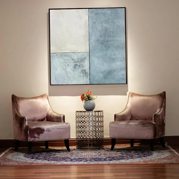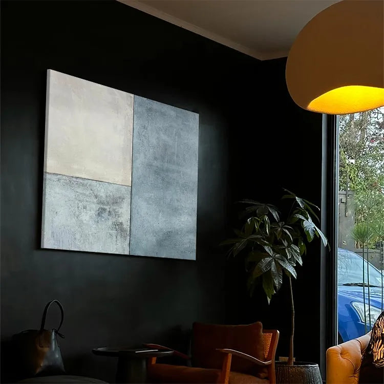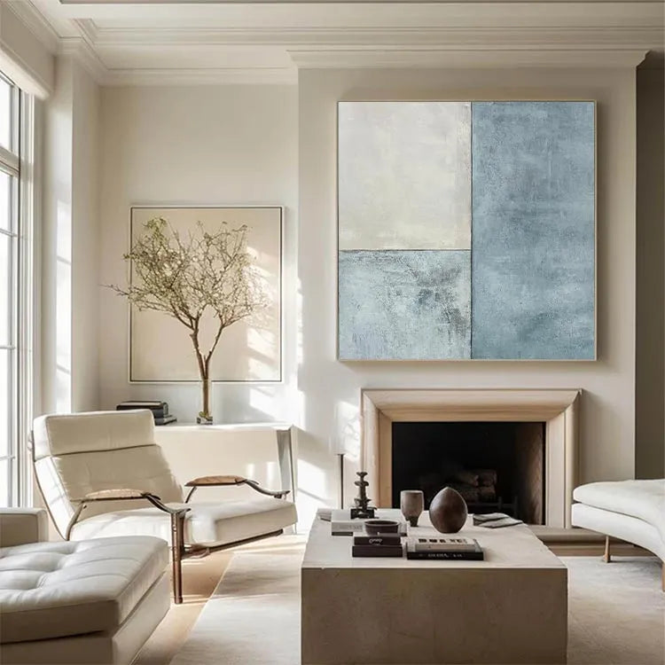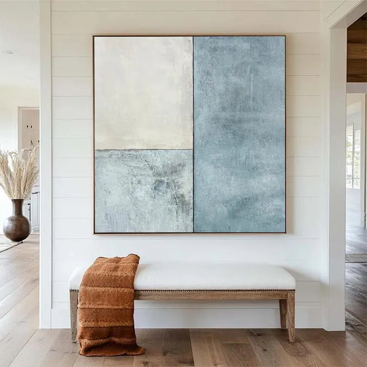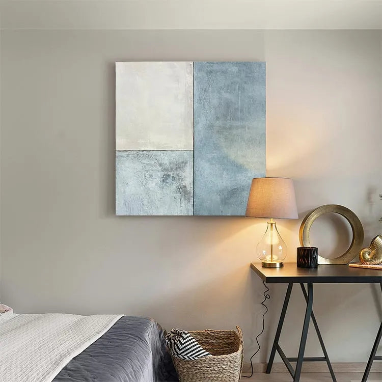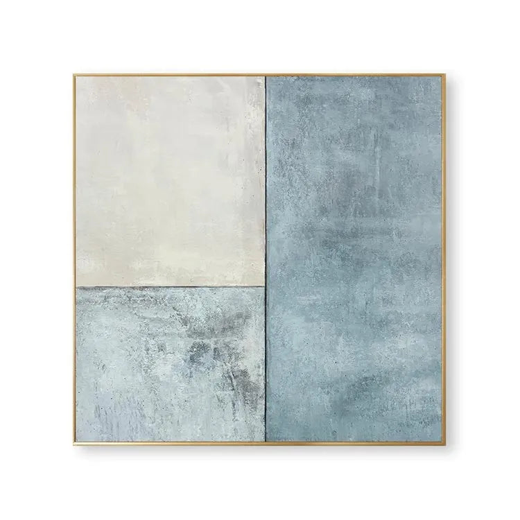 This abstract painting employs a minimalist approach, dividing the canvas into four distinct quadrants, each with a different texture and color. The left top quadrant features a smooth, pale beige surface, while the adjacent bottom quadrant displays a slightly rougher, light blue texture. The right side is dominated by a larger, more textured blue section, with subtle variations in shade and texture. The vertical line separating the beige and blue sections creates a sense of balance and division. The use of muted colors and textured surfaces suggests a contemporary minimalist style, with influences from abstract expressionism. The interplay of smooth and rough textures adds depth and complexity, inviting viewers to explore the tactile qualities of the materials.