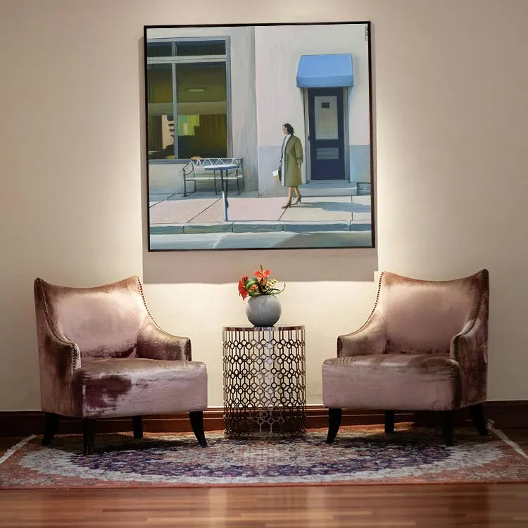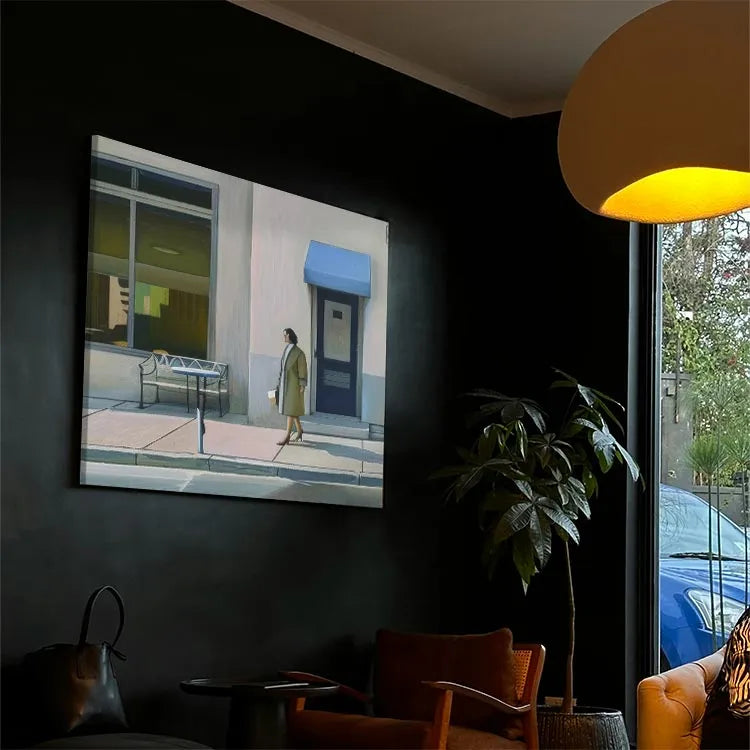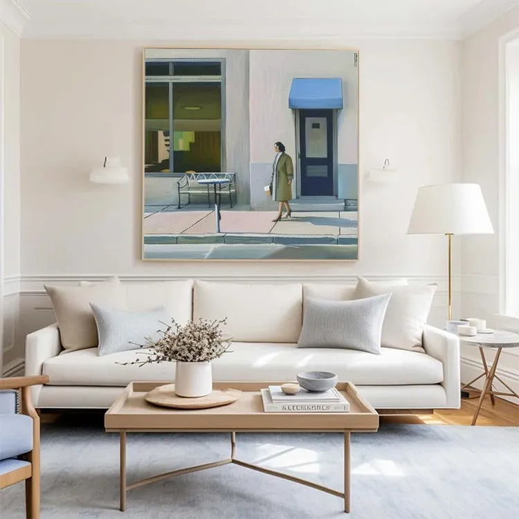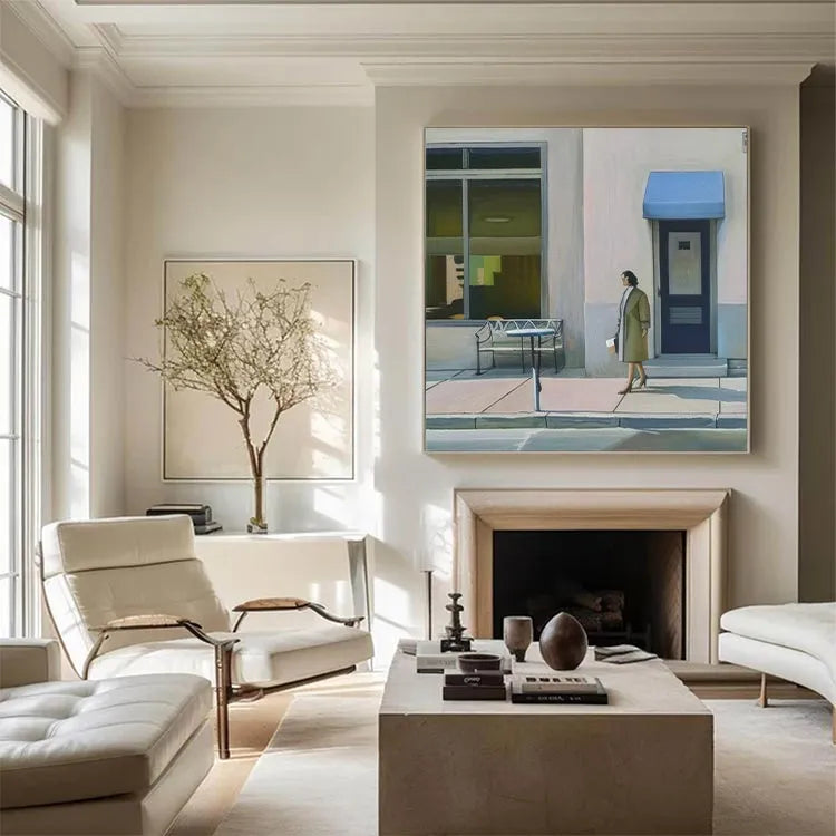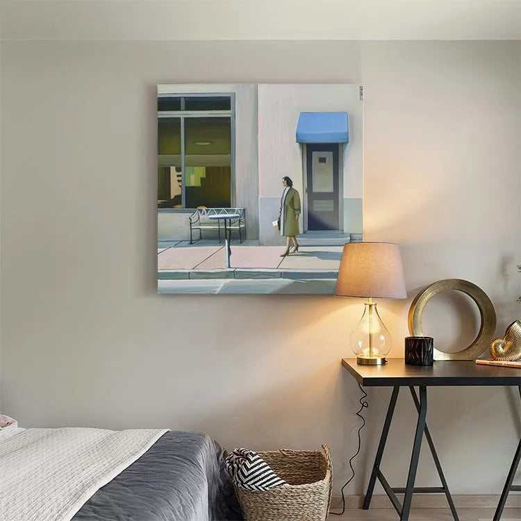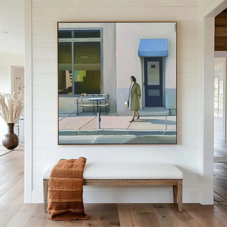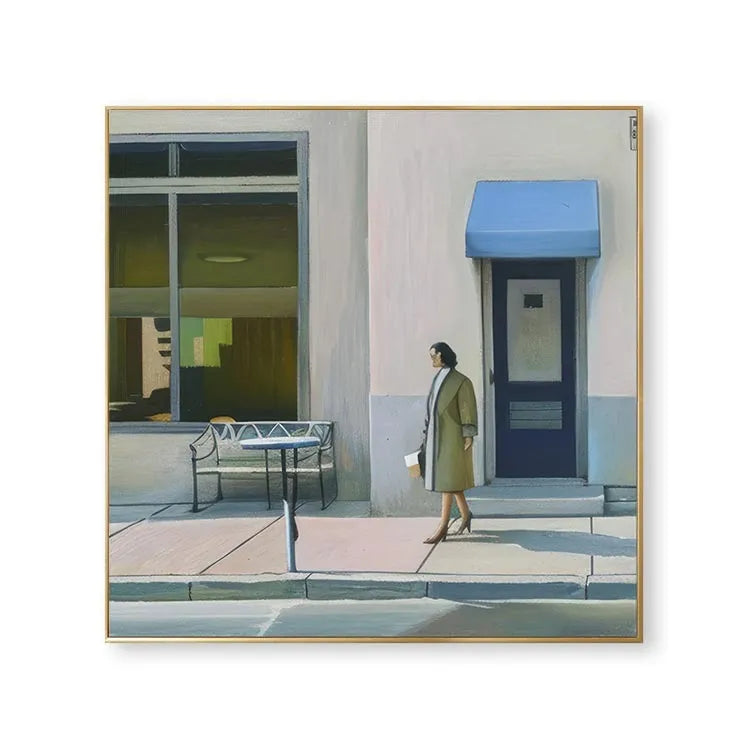 This painting, with its realistic yet slightly stylized approach, suggests influences from both realism and modernism. The composition centers on a solitary woman walking past a storefront, creating a narrative of daily life. The use of color is restrained, with a muted palette of beige, blue, and gray, which evokes a sense of calm and introspection. Light is masterfully employed, with the sunlight casting soft shadows and highlighting the woman's figure and the textures of the building's façade. The brushstrokes are delicate and precise, adding a sense of realism while maintaining a painterly quality. The woman's attire and the minimalist setting suggest a focus on everyday human experiences, aligning with the tenets of modernist art. The overall style is reminiscent of the early 20th-century American realist movement.