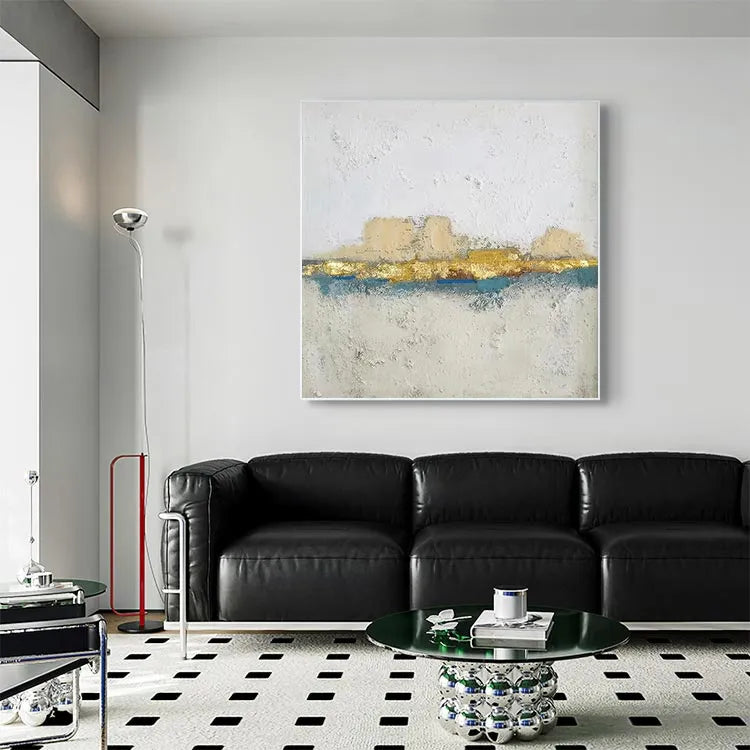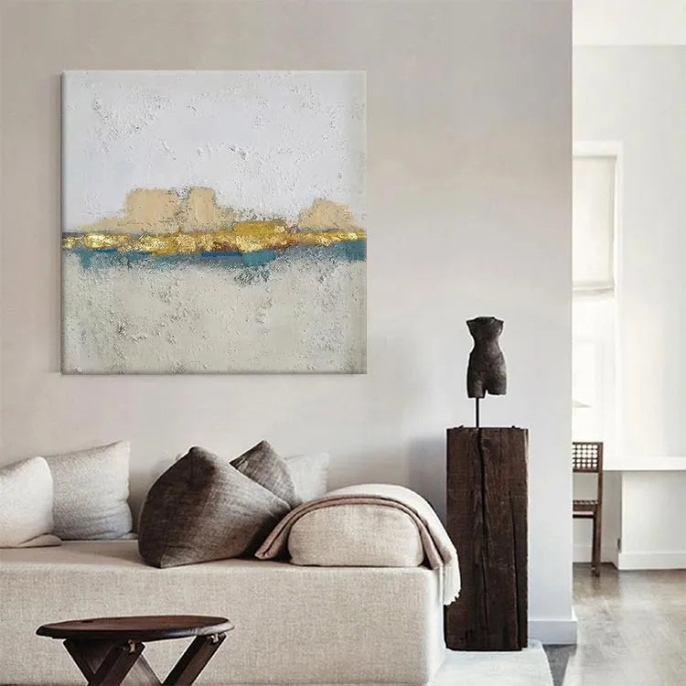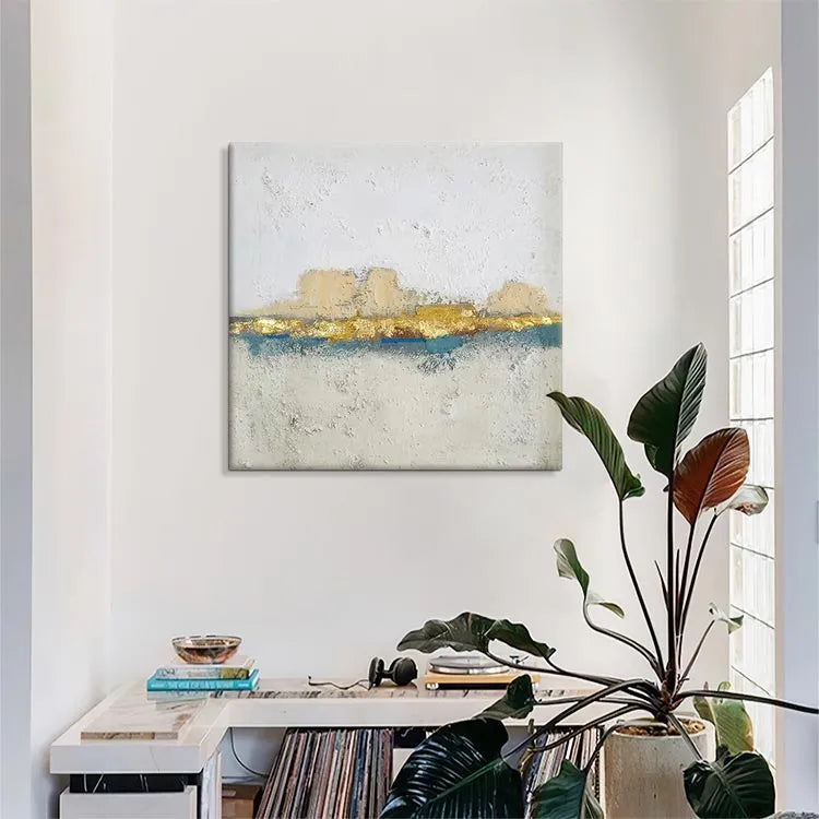 This oil painting exhibits a minimalist, abstract style, characterized by its textured, rough surface and subdued color palette. The composition features a horizontal band of golden-yellow and blue, set against a white, textured background, evoking a sense of calm and simplicity. The texture, achieved through visible brushstrokes and possibly a scraping technique, adds a tactile quality to the work. The golden-yellow suggests warmth and light, contrasting with the cool blue and the neutral white. This piece may belong to the abstract expressionism movement, with its emphasis on texture and emotional response over realistic representation. The use of color and texture creates a meditative, yet dynamic visual experience.