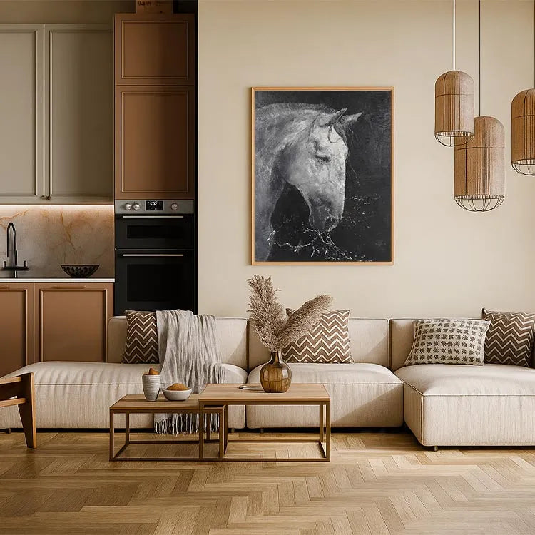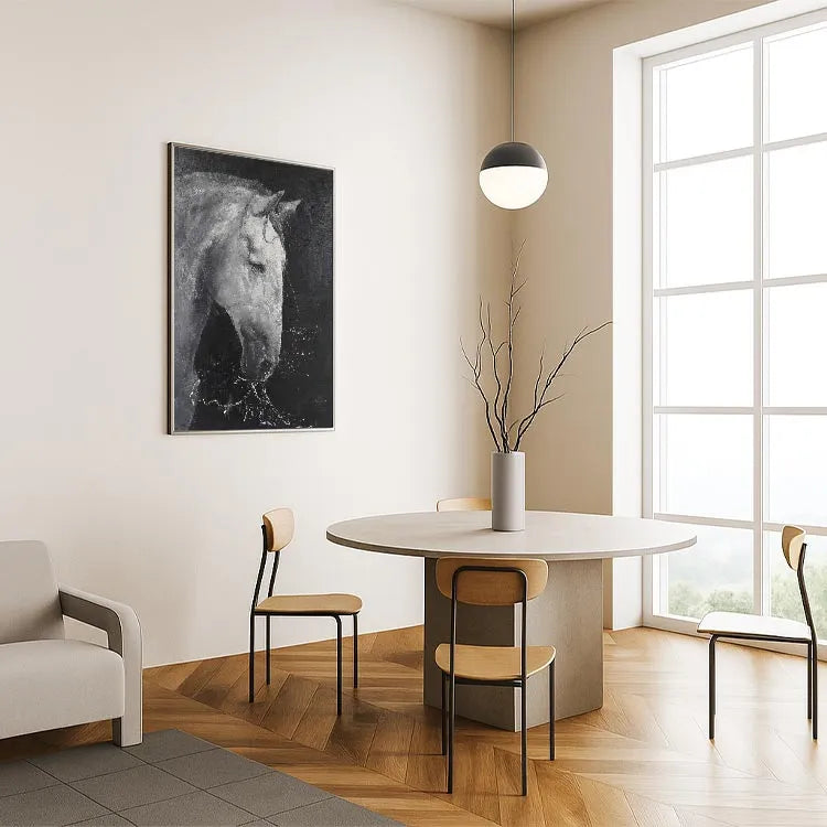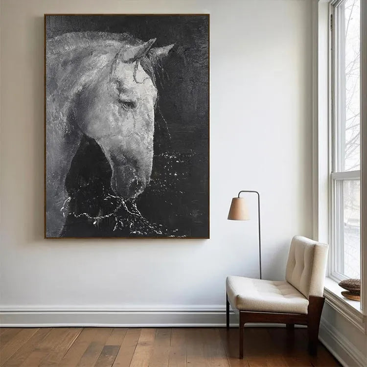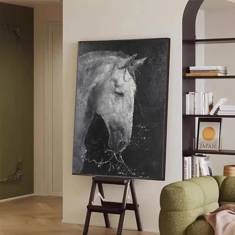 This oil painting depicts a contemplative white horse, rendered with textured brushstrokes that convey a sense of depth and realism. The monochromatic palette, dominated by shades of black and white, creates a stark contrast that emphasizes the horse's serene expression. The artist employs chiaroscuro, with subtle highlights on the horse's face and mane, enhancing its three-dimensional form. The textured, almost abstract background contrasts with the more defined, realistic portrayal of the horse, suggesting a contemplative or introspective mood. This work aligns with the realism movement, yet its textured, almost impressionistic background hints at a modern reinterpretation. The use of light and texture evokes a sense of quiet dignity and introspection.