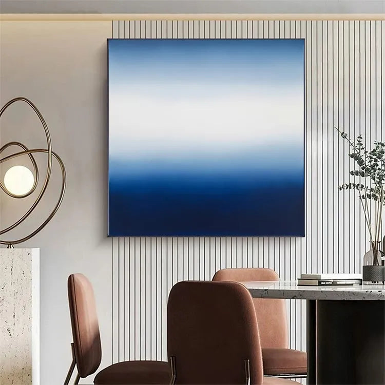 This abstract painting employs a gradient transition from deep blue at the bottom to white in the center, and then to a lighter blue at the top. The smooth, seamless blending of colors suggests a digital or photographic effect, rather than traditional brushstrokes. The simplicity and minimalism evoke a sense of calm and introspection. The use of color gradients can symbolize the passage of time, the sky at different hours, or the depth of an ocean. The lack of distinct shapes or textures aligns it with modern and contemporary abstract movements, focusing on color and form rather than narrative or realism.
