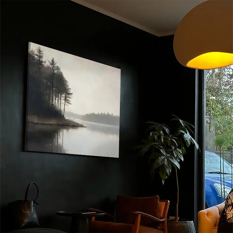 This painting exemplifies the qualities of Romanticism, focusing on the serene and mysterious beauty of nature. The composition uses a subtle diagonal line formed by the shoreline and the trees, leading the viewer's eye from the left to the right. The use of color is minimalistic, with a soft, muted palette of grays, browns, and greens, creating a tranquil and introspective mood. The light is diffused, suggesting either early morning or late afternoon, with a gentle mist adding a sense of depth and atmosphere. The texture is smooth, with delicate brushstrokes that convey the calmness of the water and the quietness of the forest. The reflection in the water is subtly rendered, adding to the painting's ethereal quality. The overall style is reminiscent of 19th-century landscape paintings, emphasizing nature's sublime beauty and tranquility.