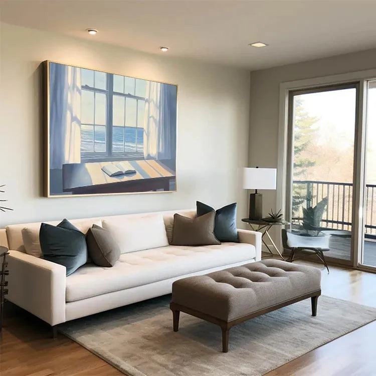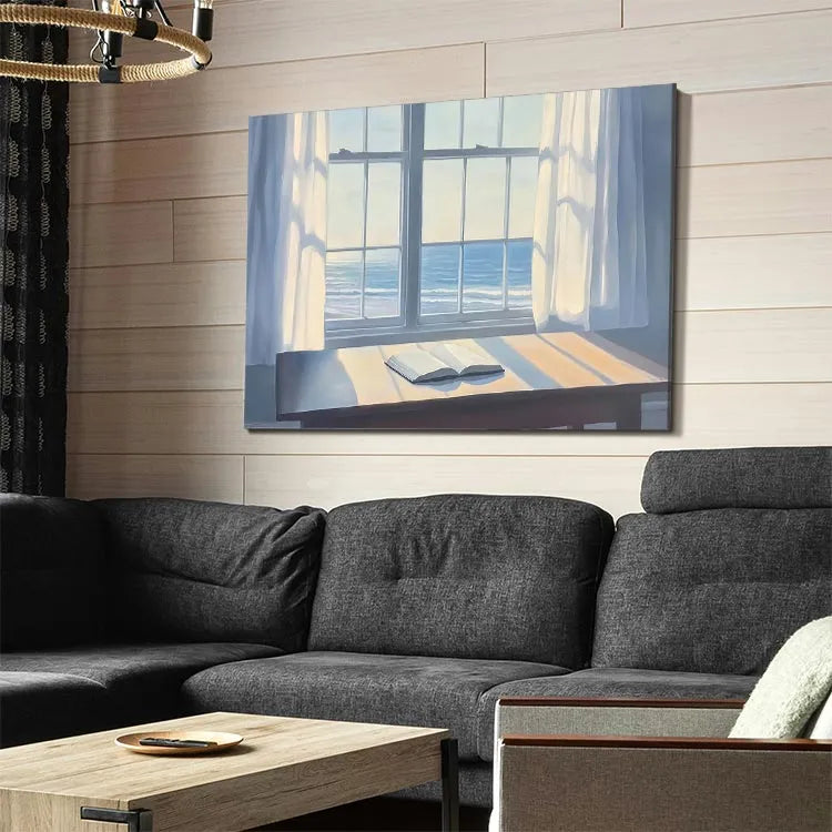 This oil painting, exemplifies the principles of Impressionism through its focus on light and its transient effects. The composition centers on a sunlit window with white curtains, casting soft shadows onto a wooden table and an open book. The color palette is predominantly cool, with blues and whites, evoking a serene, early morning or late afternoon atmosphere. The use of light and shadow is masterful, creating a sense of depth and tranquility. The smooth, almost pastel-like texture of the brushstrokes enhances the gentle, soothing mood. The symbolic presence of the open book suggests contemplation or a peaceful moment of reading, while the view of the ocean outside adds a layer of introspection and natural beauty.
