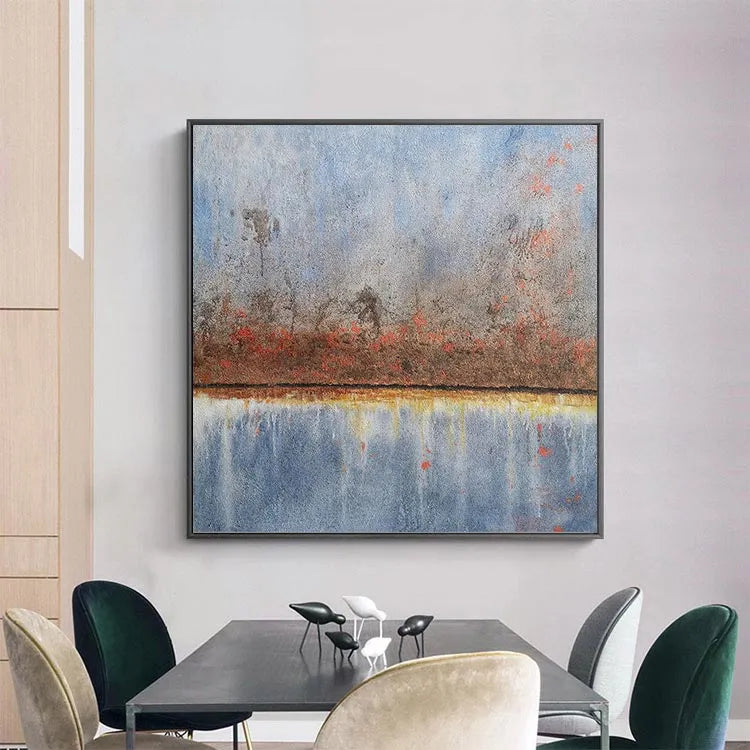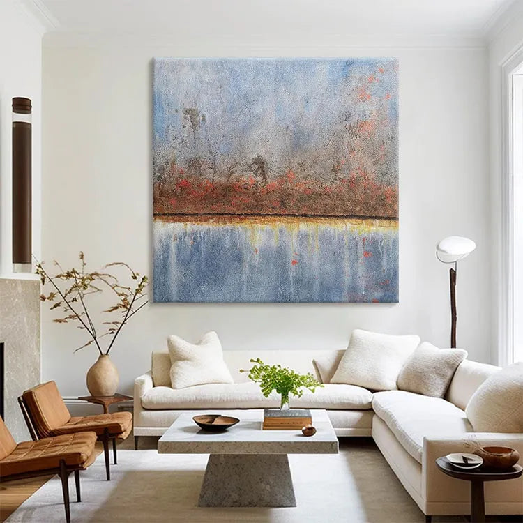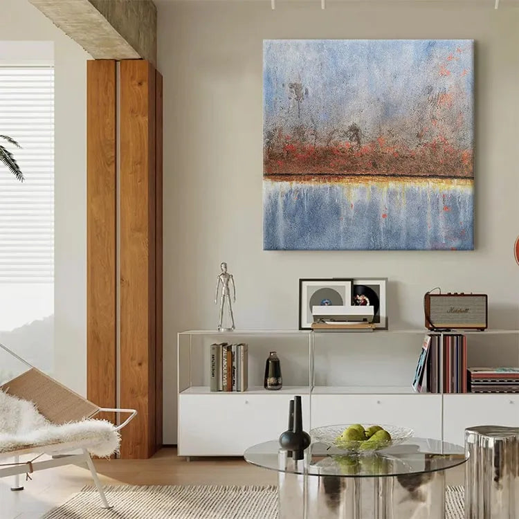 This oil painting exhibits a textured, almost weathered appearance, with a muted color palette dominated by blues, grays, and rust-colored hues. The composition features a horizontal line dividing the upper and lower sections, reminiscent of a water's reflection. The rough texture and subtle, diffuse brushstrokes suggest an impressionistic influence, while the abstract, minimalistic forms evoke a sense of quiet, introspective solitude. The use of color, with its juxtaposition of cool blues and warm rusts, creates a balanced, yet contemplative mood. The light is diffused and subtle, enhancing the painting's serene and reflective quality. The overall style aligns with the modern abstract movement, emphasizing texture and emotional resonance over detailed realism.