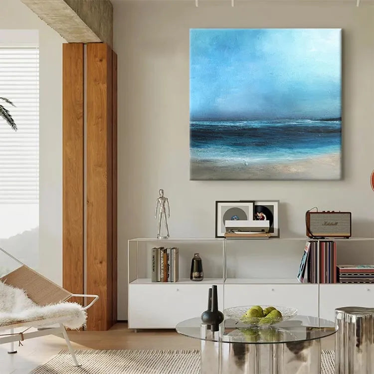 This oil painting captures a serene coastal landscape, characterized by its tranquil, almost abstract composition. The artist employs a restrained color palette dominated by various shades of blue, from the pale sky to the deep, dark ocean, creating a soothing visual gradient. The brushstrokes are subtle and smooth, suggesting a gentle, almost misty atmosphere. The transition from the sandy beach in the foreground to the turbulent sea in the midground is subtly indicated by the artist's use of light and texture. The sky, painted with delicate, almost ethereal brushstrokes, suggests a calm, overcast day. This work aligns with the Impressionist movement, emphasizing mood and atmosphere over detailed realism. The use of color and light effectively conveys the tranquil yet dynamic nature of the seaside.