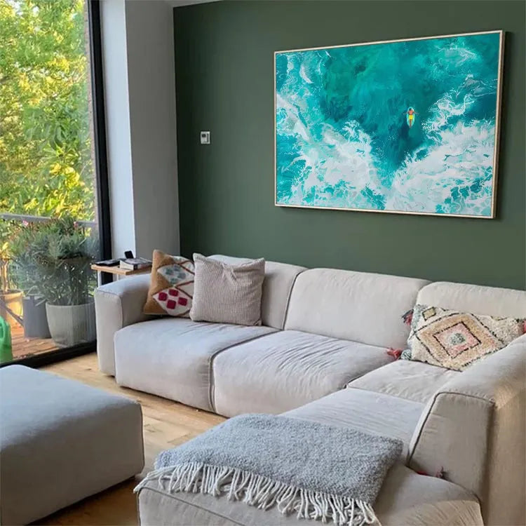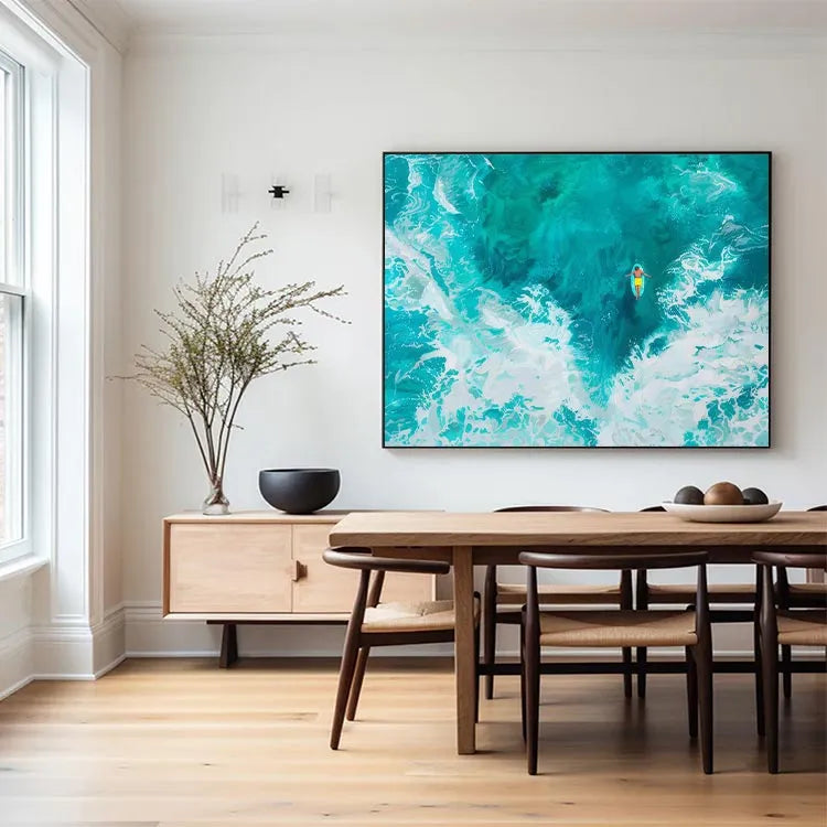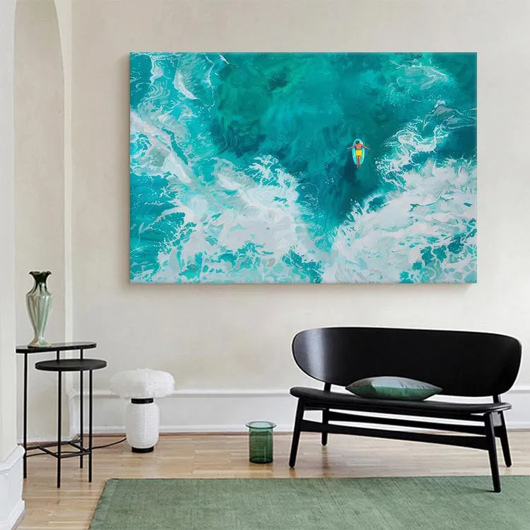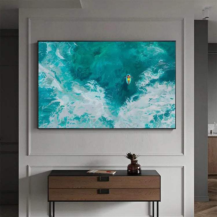 This oil painting captures a solitary figure in a small boat, centered amidst turbulent, turquoise waters. The composition utilizes a top-down perspective, emphasizing the isolation and vulnerability of the subject. The vibrant, turquoise and white color palette evokes a sense of both tranquility and turmoil. The artist employs fluid, dynamic brushstrokes to convey the movement of the waves, creating a sense of texture and depth. The light plays across the water's surface, highlighting the contrasts between the darker, deeper waters and the brighter, foamy edges. This work may be associated with the modernist movement, specifically the Fauvism style, characterized by its bold use of color and emotional expression. The solitary figure symbolizes the human condition, navigating uncertainty and the vast, unpredictable sea.