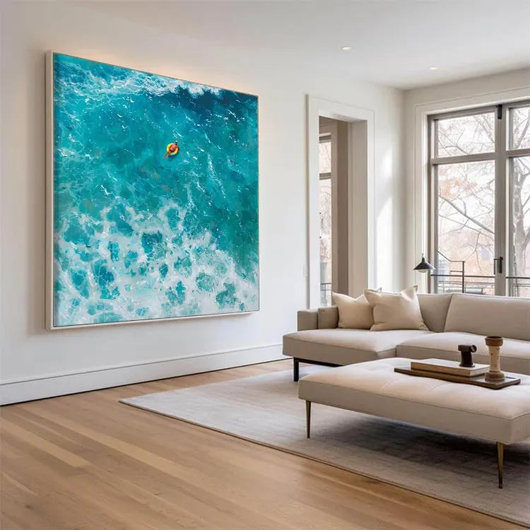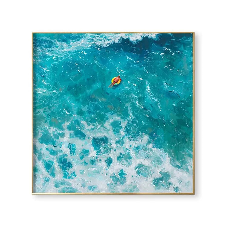 This painting captures a vibrant, aerial view of a lone, yellow inflatable raft floating in the ocean. The composition is dynamic, with the swirling, turquoise waves creating a sense of movement and depth. The use of color is striking, with the bright yellow of the raft contrasting sharply against the varying shades of blue and white in the water. The light is natural, suggesting a sunny day, and it enhances the texture of the waves, which appear both frothy and translucent. The painting's style leans towards realism with a touch of impressionism, evident in the fluid, almost abstract depiction of the water. The texture is smooth yet detailed, with visible brushstrokes adding a sense of immediacy and immediacy to the scene. The work evokes themes of isolation and the beauty of nature.
