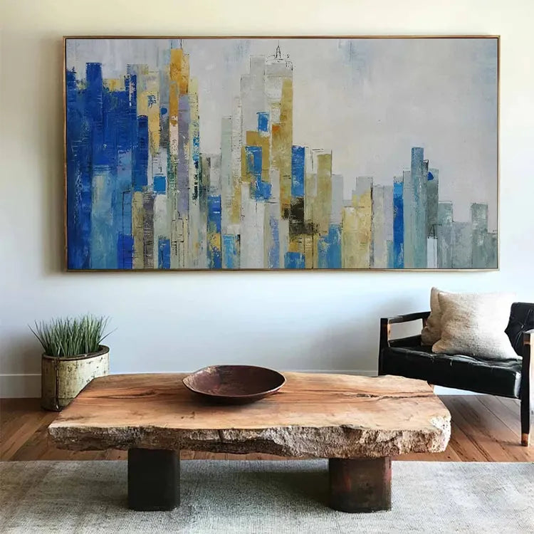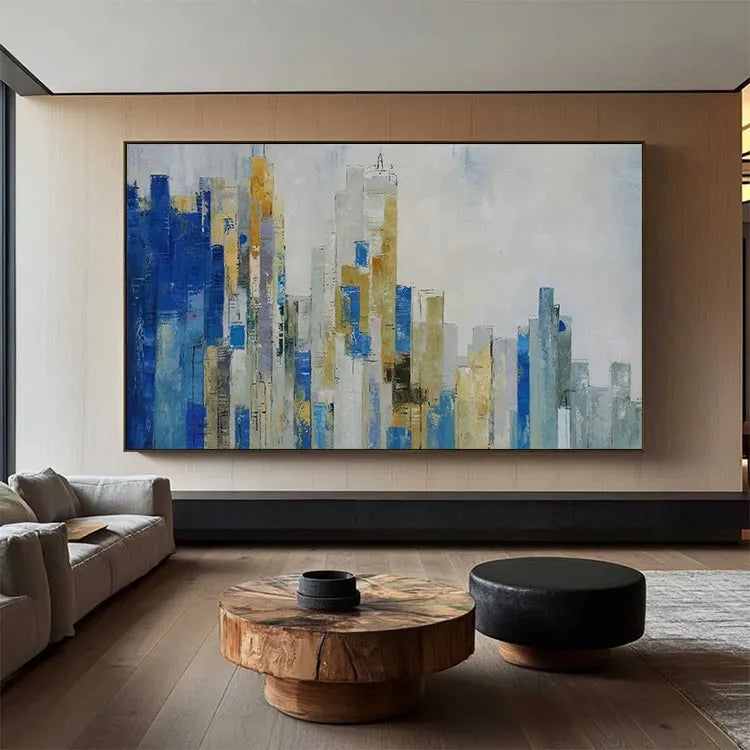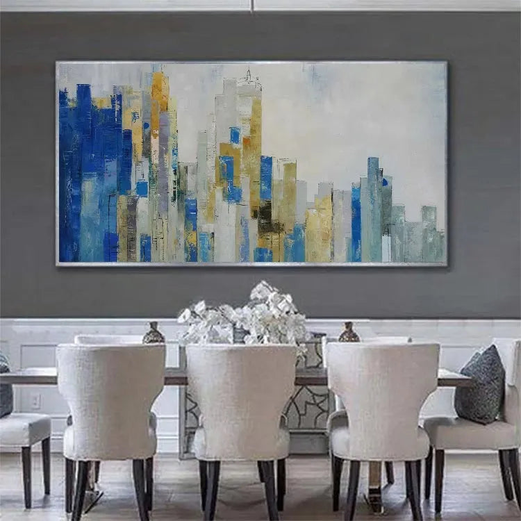 This abstract painting employs a modernist style, characterized by its geometric, vertical forms and a limited but effective color palette. The artist uses a combination of blue, yellow, and white, with subtle hints of gray and brown, to create a cityscape. The brushstrokes are varied, with some areas displaying smooth, flat textures while others are more textured and layered, suggesting the varying heights and densities of the buildings. The use of color is symbolic, with the blues possibly representing water or sky, and the yellows and whites suggesting sunlight and skyscrapers. The composition is balanced, with a slightly asymmetrical arrangement that adds dynamism. This work likely belongs to the abstract expressionism movement, focusing on the emotional and interpretive aspects of the urban environment.