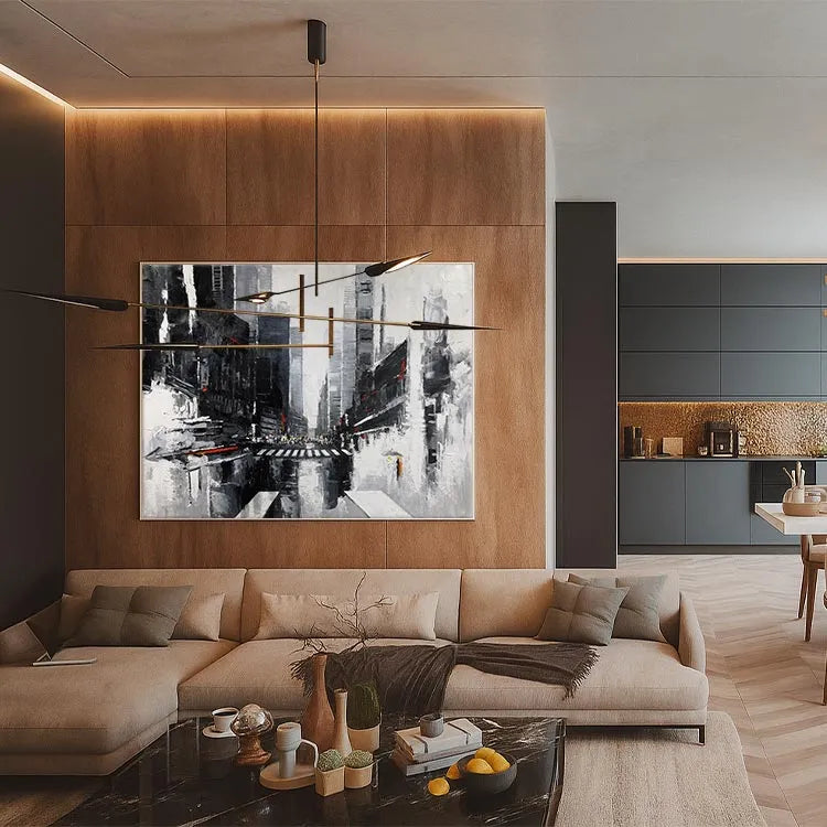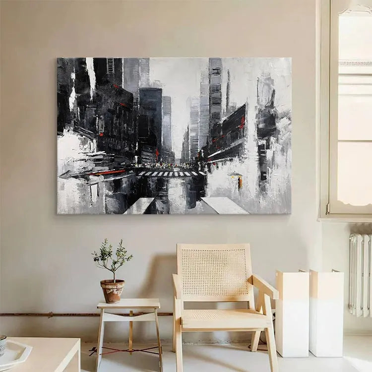 This abstract urban painting employs a monochromatic palette dominated by blacks, greys, and whites, with sporadic red accents. The composition features a vanishing point perspective, drawing the viewer's eye down a narrow, towering cityscape. Brushstrokes are bold and expressive, creating a textured, almost chaotic feel that contrasts with the structured lines of the buildings. The use of light and shadow adds depth, while the red highlights suggest urgency or danger. The style is reminiscent of the Expressionist movement, with its emphasis on emotion and the urban experience. The abstract nature and loose brushwork evoke a sense of disorientation and the overwhelming scale of city life.