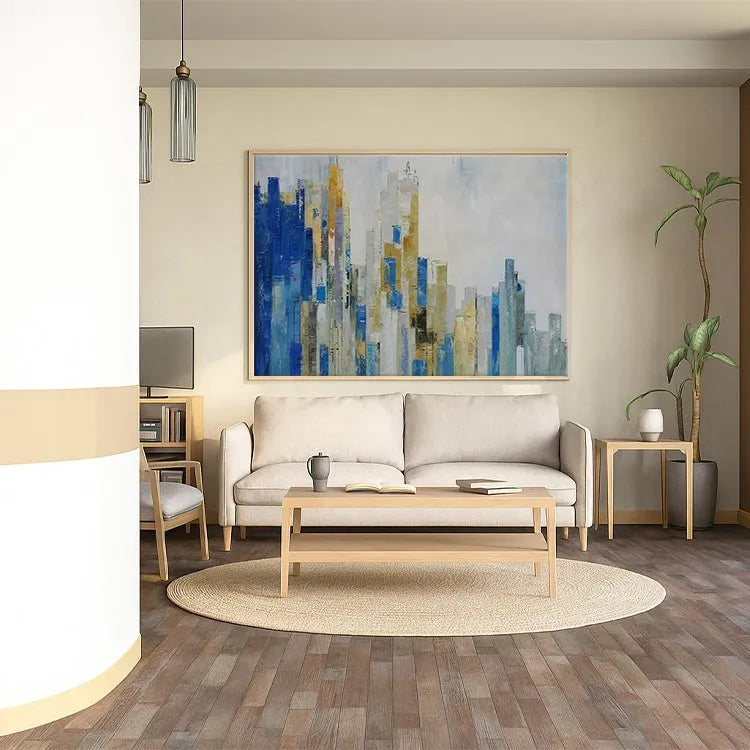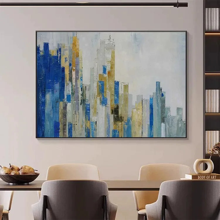 This abstract painting features a cityscape composed of vertical, rectangular forms in a palette of blue, yellow, and gray. The brushstrokes are textured and layered, creating a sense of depth and dimension. The use of color is restrained yet effective, with the cool blues contrasting against the warmer yellows, suggesting both tranquility and vibrancy. The light application is subtle, with a gentle gradient from the top to bottom, enhancing the verticality of the structures. The overall style is reminiscent of the Abstract Expressionism movement, with its emphasis on form and color over realism. The textured, almost scraped surface adds a tactile quality, enhancing the visual experience.