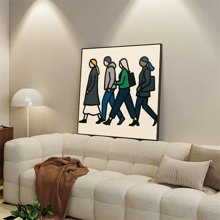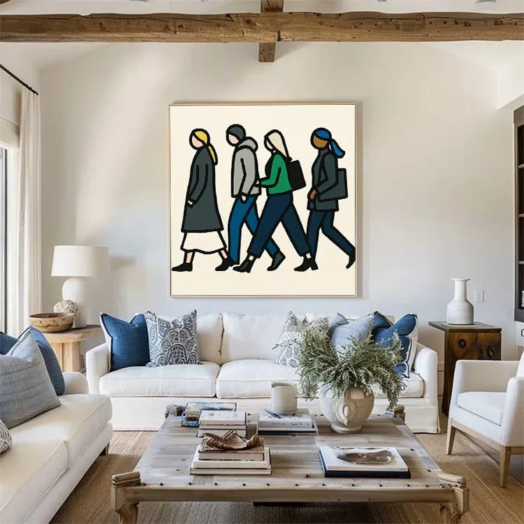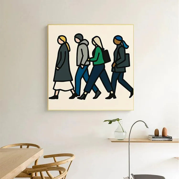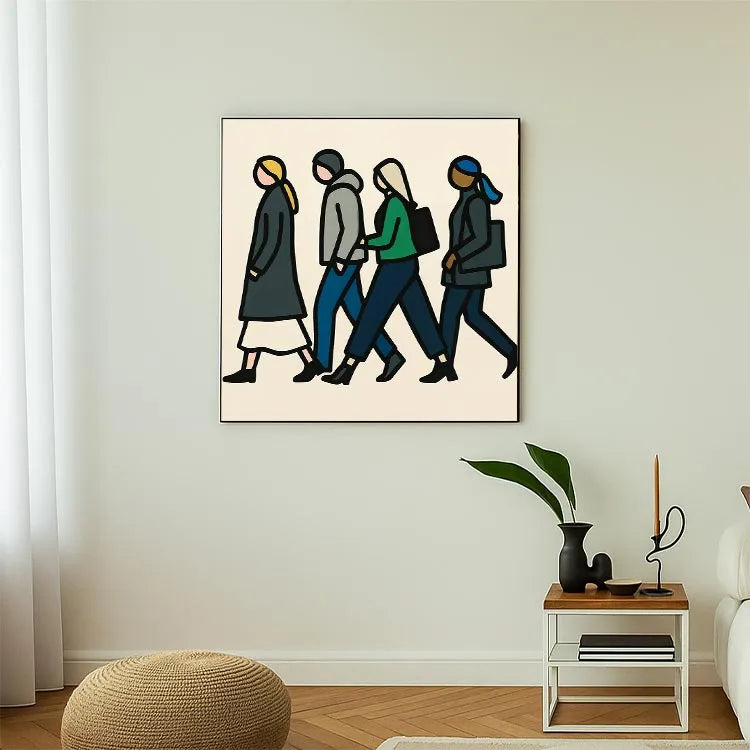 This digital artwork, characterized by its minimalist and flat color style, employs bold, black outlines to define the figures of four walking individuals. The composition is balanced with a clear horizontal line created by their strides, suggesting movement and unity. The use of muted, earthy tones—dark greys, blues, and greens—contrasts with the brighter blonde and blue hair, drawing attention to the figures' heads. The simple, almost cartoon-like forms and lack of detailed textures suggest influences from modernist and abstract movements, focusing on form and movement rather than realism. The smooth, flat color application and lack of shading emphasize the artwork's geometric simplicity and directness.