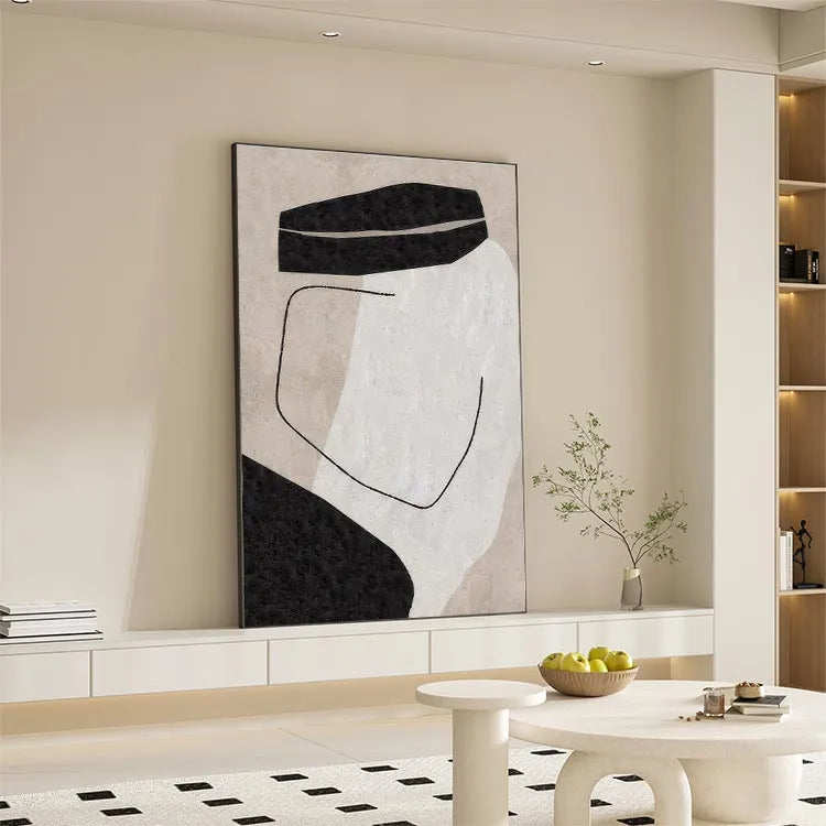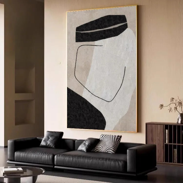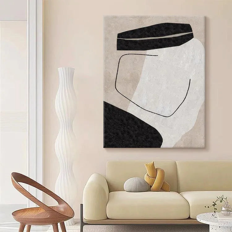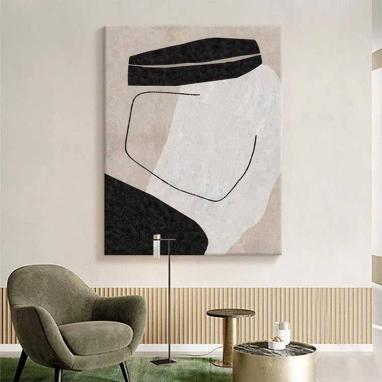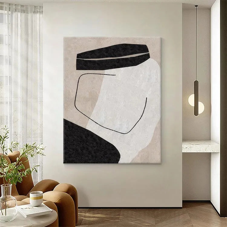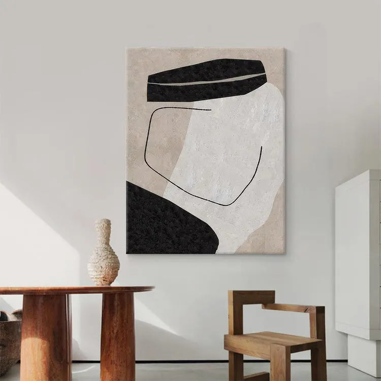 This oil painting exhibits a minimalist, abstract style, reminiscent of the Bauhaus movement. The composition is characterized by simple, geometric forms: two black, rectangular shapes on the top and bottom, and a central white area, creating a stark contrast. A thin, black, curved line intersects the white space, adding a sense of movement and balance. The use of color is restrained, with the black and white forms set against a beige background, emphasizing purity and simplicity. The texture is smooth, with subtle variations in the background, suggesting a digital brushstroke effect. The overall effect is one of quiet elegance and introspective contemplation.