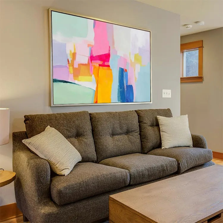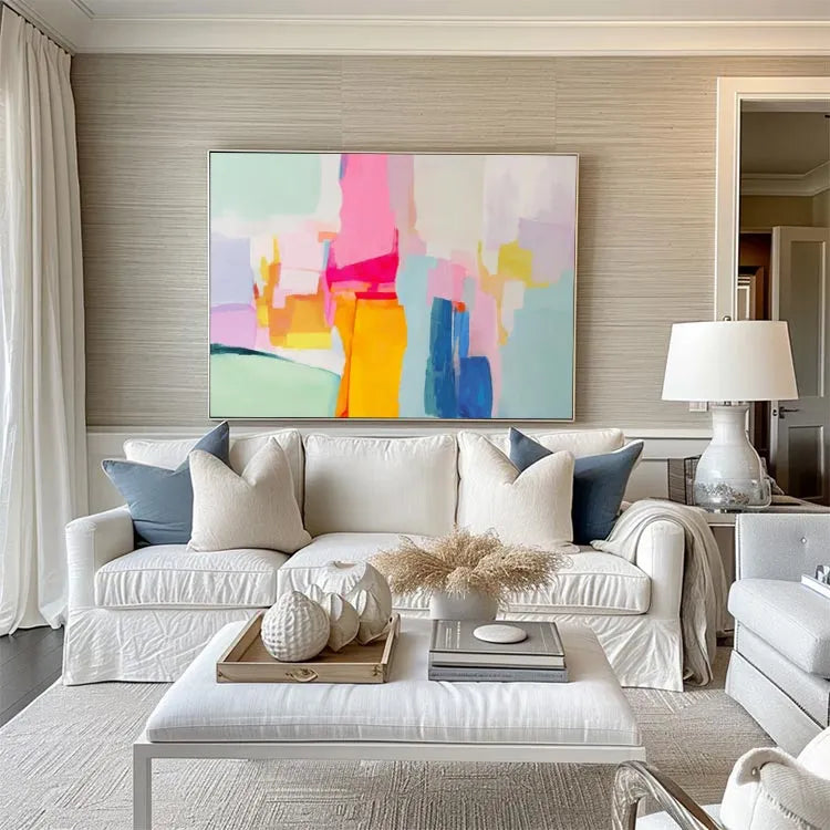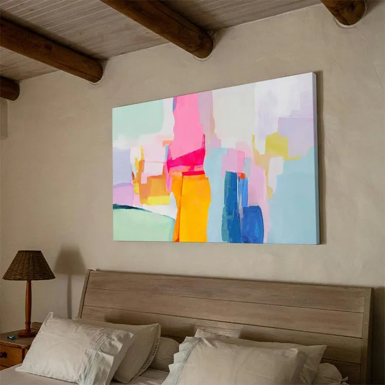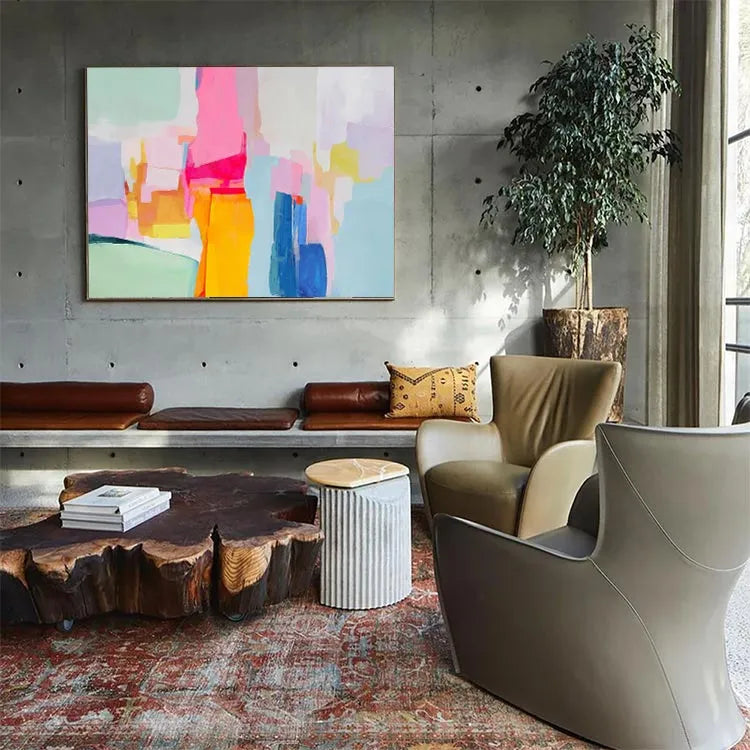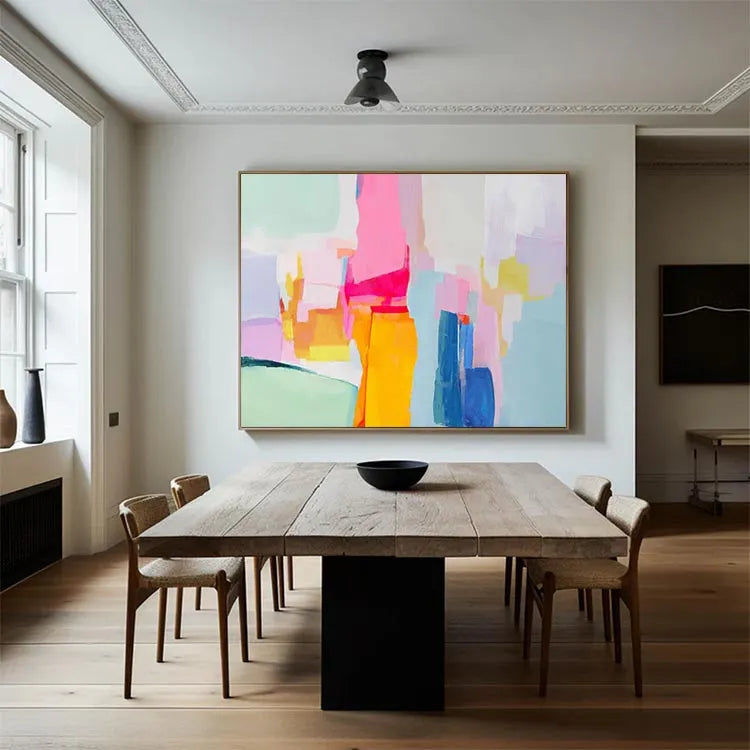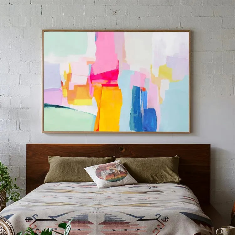 This oil painting features a vibrant, abstract composition characterized by its use of bold, geometric shapes and a harmonious color palette. The artist employs a modern, abstract style, reminiscent of the Fauvism movement, with its emphasis on vivid, unmodulated colors and simplified forms. The juxtaposition of bright pink, yellow, blue, and red shapes against a soft, pastel background creates a dynamic visual tension. The brushstrokes are visible, adding texture and a sense of movement to the composition. The use of color suggests a playful, yet abstract representation, potentially symbolizing a lively urban landscape or a celebration of modernity. The overall effect is one of energetic simplicity, inviting the viewer to interpret the scene through its vibrant, yet subtle, color interactions.