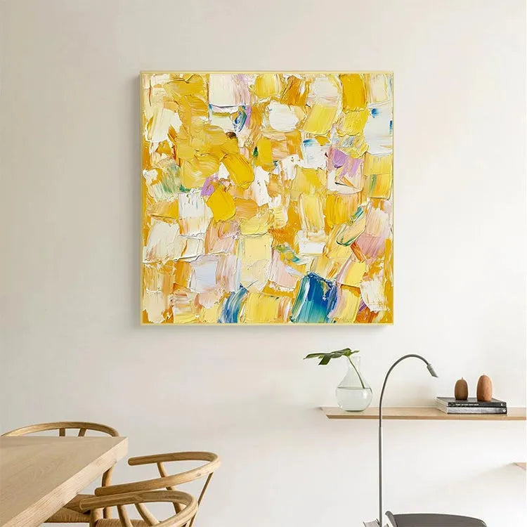 This abstract painting features a dynamic composition of thick, textured brushstrokes in vibrant yellow, white, and subtle blue hues. The use of color is striking, with the dominant yellows creating a sense of warmth and energy, while the white and blue accents introduce a cooler, more nuanced contrast. The textured brushstrokes suggest a tactile quality, inviting the viewer to consider the physicality of the medium. The irregular, overlapping forms evoke a sense of movement and spontaneity, characteristic of the Abstract Expressionist movement. The painting's lightness and vibrancy are balanced by the subtle interplay of colors and textures, creating a visually engaging and emotionally dynamic piece.