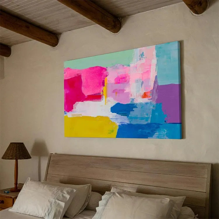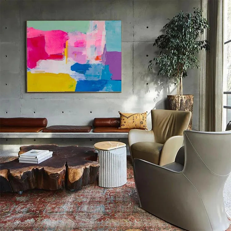 This oil painting exhibits a vibrant, abstract composition characterized by bold, overlapping color blocks. The use of bright pink, yellow, blue, and purple hues creates a dynamic visual contrast, evoking a sense of joy and spontaneity. The thick, textured brushstrokes add a tactile quality, enhancing the painting's three-dimensional effect. The interplay of light and shadow is subtle yet effective, with the translucent layers of color suggesting depth and movement. The painting's style aligns with Abstract Expressionism, emphasizing emotional expression over representational accuracy. The chaotic yet harmonious arrangement of colors and textures suggests a celebration of color and form, inviting viewers to interpret the work subjectively.