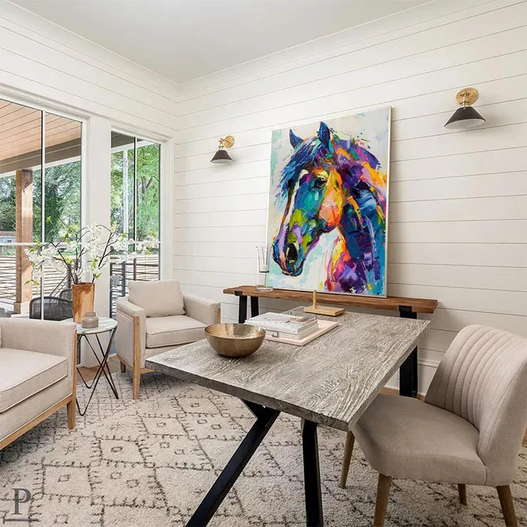 This vibrant, abstract painting of a horse employs a vivid, multicolored palette that contrasts sharply with the white background. The use of bold, expressive brushstrokes creates a dynamic texture, emphasizing movement and energy. The artist employs a mix of thick and thin applications of paint, adding depth and complexity to the composition. The horse's form is fragmented, with colors blending and bleeding into each other, suggesting a sense of fluidity and spontaneity. This piece may belong to the Abstract Expressionism movement, characterized by its emphasis on emotional expression and the subconscious. The colorful, chaotic brushstrokes evoke a sense of vitality and freedom, while the fragmented depiction of the horse hints at the complexities of nature.