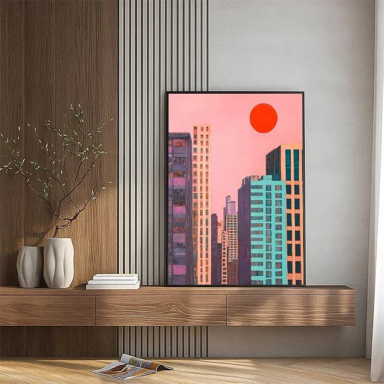 This painting, likely influenced by the urbanism movement, features a striking cityscape with tall buildings set against a vivid pink sky, dominated by a large, vivid red sun. The artist employs a bold, flat color palette, emphasizing the contrast between the warm pink and the cool blue and beige buildings. The composition uses vertical lines to create a sense of towering structure, while the red sun adds a dynamic, almost surreal element. The texture appears smooth, with digital effects suggesting a contemporary style. The use of color and light suggests a symbolic representation of urban life and its juxtaposition with nature.
